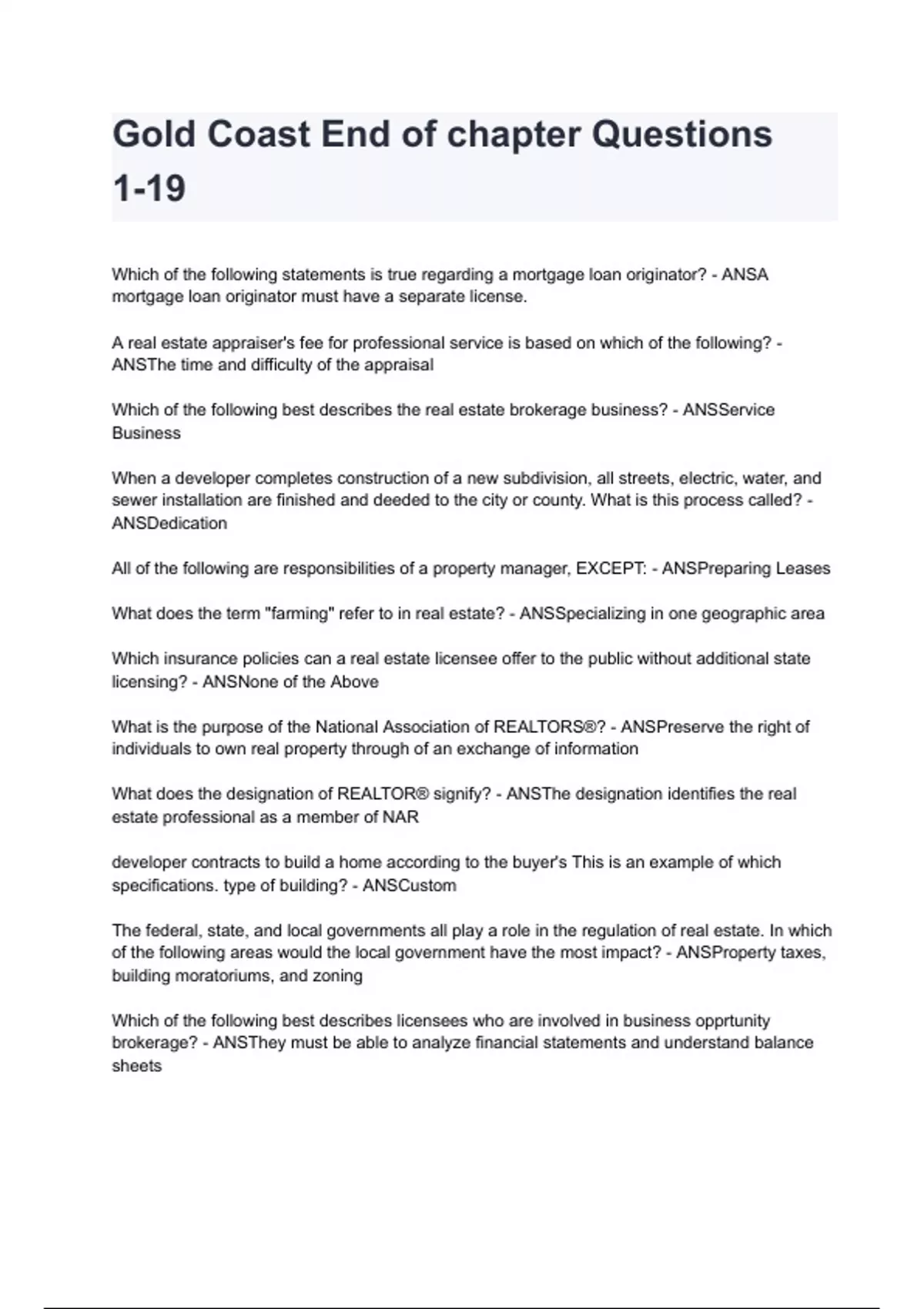 Gold Coast End of chapter Questions 1-19 questions and answers already graded A+ 2024/2025