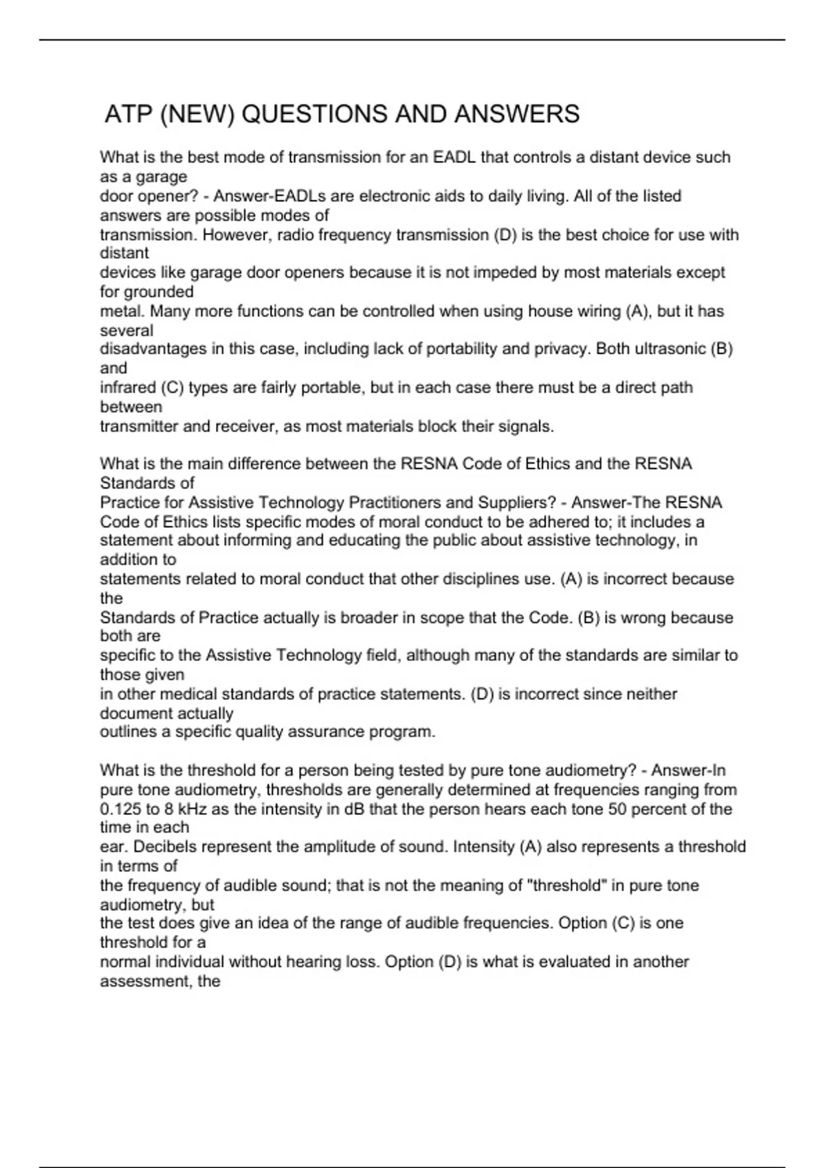 What is the best mode of transmission for an EADL that controls a distant device such as a garage door opener? - Answer-EADLs are electronic aids to daily living. All of the listed answers are possible modes of transmission. However, radio frequency transmission (D) is the best choice for use with distant devices like garage door openers because it is not impeded by most materials except for grounded metal. Many more functions can be controlled when using house wiring (A), but it has several disadvantages in this case, including lack of portability and privacy. Both ultrasonic (B) and infrared (C) types are fairly portable, but in each case there must be a direct path between transmitter and receiver, as most materials block their signals. What is the main difference between the RESNA Code of Ethics and the RESNA Standards of Practice for Assistive Technology Practitioners and Suppliers? - Answer-The RESNA Code of Ethics lists specific modes of moral conduct to be adhered to; it includes a statement about informing and educating the public about assistive technology, in addition to statements related to moral conduct that other disciplines use. (A) is incorrect because the Standards of Practice actually is broader in scope that the Code. (B) is wrong because both are specific to the Assistive Technology field, although many of the standards are similar to those given in other medical standards of practice statements. (D) is incorrect since neither document actually outlines a specific quality assurance program. What is the threshold for a person being tested by pure tone audiometry? - Answer-In pure tone audiometry, thresholds are generally determined at frequencies ranging from 0.125 to 8 kHz as the intensity in dB that the person hears each tone 50 percent of the time in each ear. Decibels represent the amplitude of sound. Intensity (A) also represents a threshold in terms of the frequency of audible sound; that is not the meaning of "threshold" in pure tone audiometry, but the test does give an idea of the range of audible frequencies. Option (C) is one threshold for a normal individual without hearing loss. Option (D) is what is evaluated in another ass