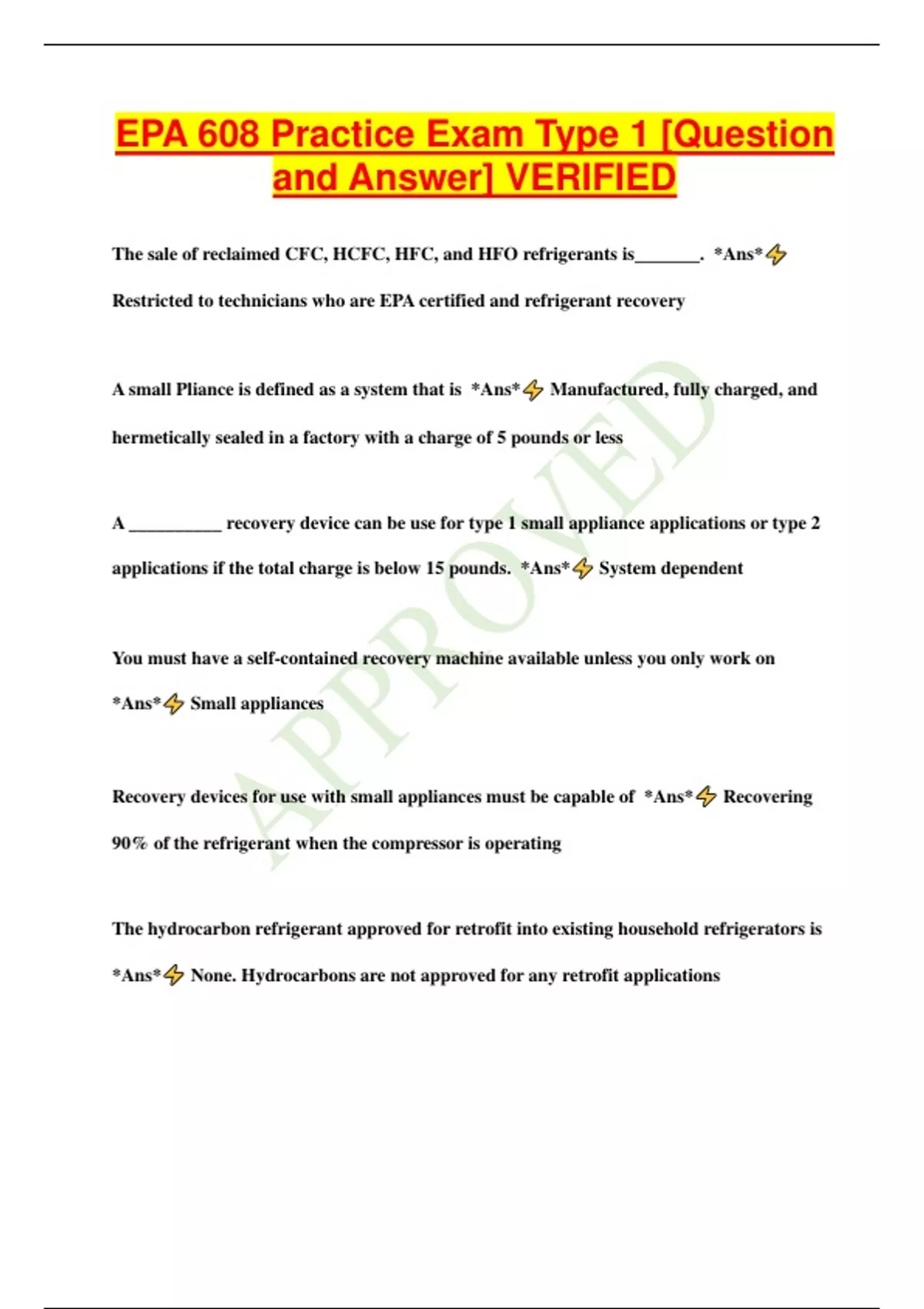 EPA 608 Practice Exam Type 1 [Question and Answer] VERIFIED