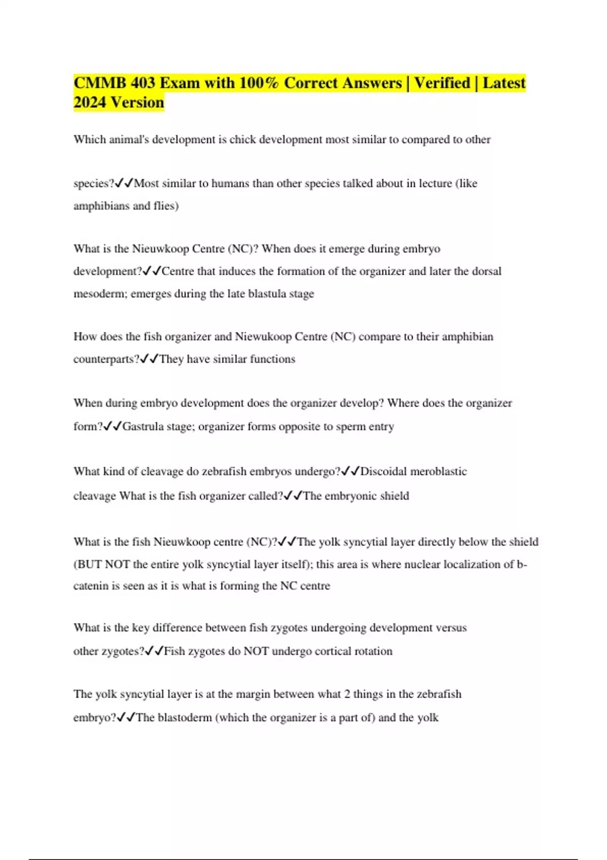 CMMB 403 Exam with 100% Correct Answers | Verified | Latest 2024 Version Which animal's development is chick development most similar to compared to other species?Most similar to humans than other species talked about in lecture (like amphibians and flies) What is the Nieuwkoop Centre (NC)? When does it emerge during embryo development?Centre that induces the formation of the organizer and later the dorsal mesoderm; emerges during the late blastula stage How does the fish organizer and Niewukoop Centre (NC) compare to their amphibian counterparts?They have similar functions When during embryo development does the organizer develop? Where does the organizer form?Gastrula stage; organizer forms opposite to sperm entry What kind of cleavage do zebrafish embryos undergo?Discoidal meroblastic cleavage What is the fish organizer called?The embryonic shield What is the fish Nieuwkoop centre (NC)?The yolk syncytial layer directly below the shield (BUT NOT the entire yolk syncytial layer itself); this area is where nuclear localization of bcatenin is seen as it is what is forming the NC centre What is the key difference between fish zygotes undergoing development versus other zygotes?Fish zygotes do NOT undergo cortical rotation The yolk syncytial layer is at the margin between what 2 things in the zebrafish embryo?The blastoderm (which the organizer is a part of) and the yolk