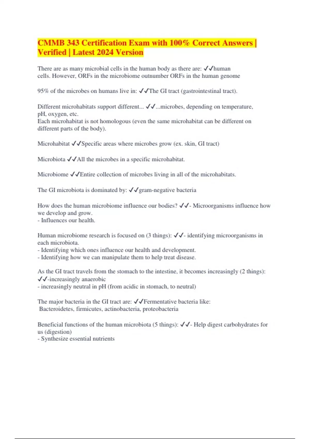 CMMB 343 Certification Exam with 100% Correct Answers | Verified | Latest 2024 Version There are as many microbial cells in the human body as there are: human cells. However, ORFs in the microbiome outnumber ORFs in the human genome 95% of the microbes on humans live in: The GI tract (gastrointestinal tract). Different microhabitats support different... ...microbes, depending on temperature, pH, oxygen, etc. Each microhabitat is not homologous (even the same microhabitat can be different on different parts of the body). Microhabitat Specific areas where microbes grow (ex. skin, GI tract) Microbiota All the microbes in a specific microhabitat. Microbiome Entire collection of microbes living in all of the microhabitats. The GI microbiota is dominated by: gram-negative bacteria How does the human microbiome influence our bodies? - Microorganisms influence how we develop and grow. - Influences our health. Human microbiome research is focused on (3 things): - identifying microorganisms in each microbiota. - Identifying which ones influence our health and development. - Identifying how we can manipulate them to help treat disease. As the GI tract travels from the stomach to the intestine, it becomes increasingly (2 things): -increasingly anaerobic - increasingly neutral in pH (from acidic in stomach, to neutral) The major bacteria in the GI tract are: Fermentative bacteria like: Bacteroidetes, firmicutes, actinobacteria, proteobacteria Beneficial functions of the human microbiota (5 things): - Help digest carbohydrates for us (digestion) - Synthesize essential nutrients