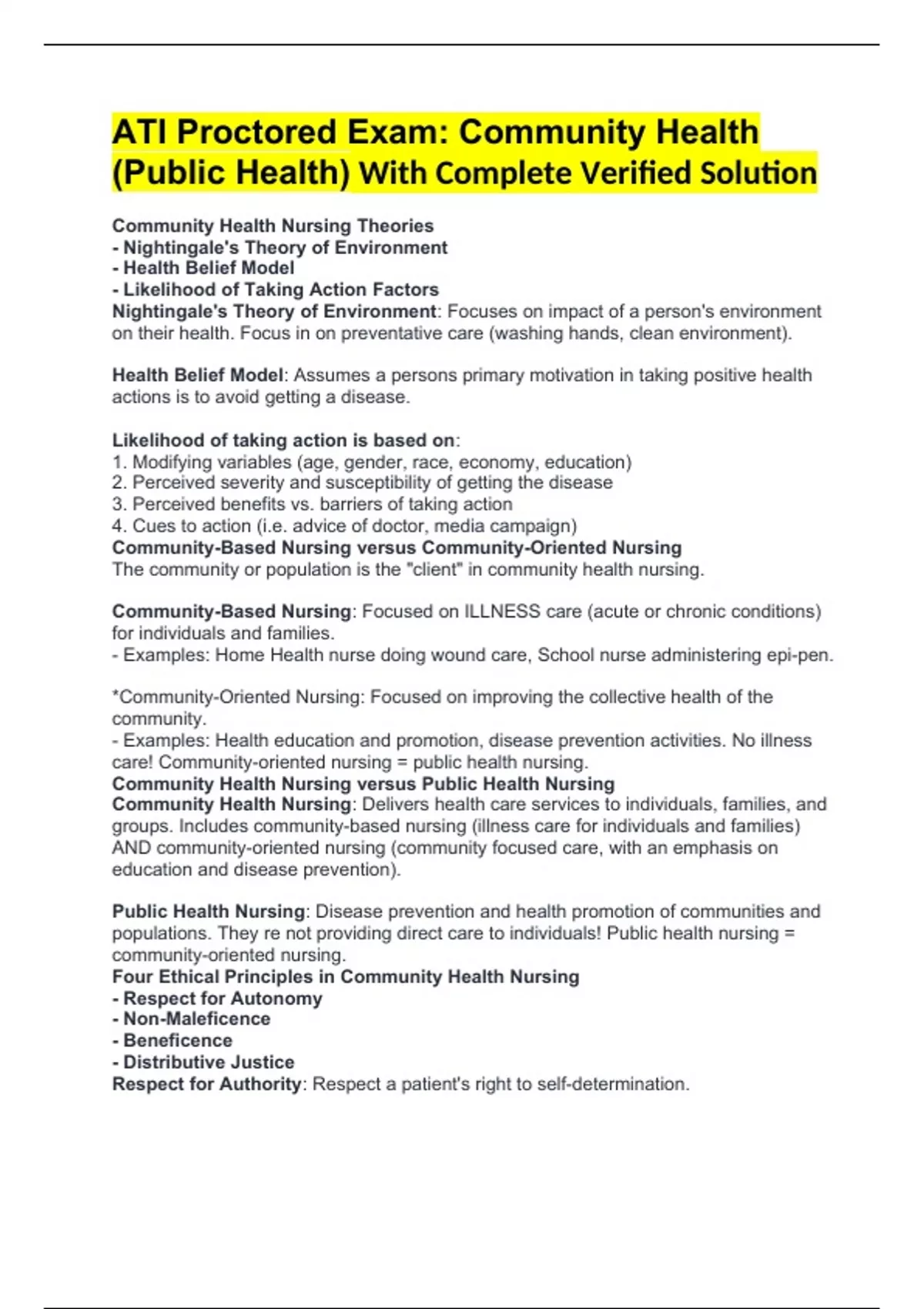 ATI Proctored Exam: Community Health (Public Health) With Complete Verified Solution Community Health Nursing Theories - Nightingale's Theory of Environment - Health Belief Model - Likelihood of Taking Action Factors Nightingale's Theory of Environment: Focuses on impact of a person's environment on their health. Focus in on preventative care (washing hands, clean environment). Health Belief Model: Assumes a persons primary motivation in taking positive health actions is to avoid getting a disease. Likelihood of taking action is based on: 1. Modifying variables (age, gender, race, economy, education) 2. Perceived severity and susceptibility of getting the disease 3. Perceived benefits vs. barriers of taking action 4. Cues to action (i.e. advice of doctor, media campaign) Community-Based Nursing versus Community-Oriented Nursing The community or population is the "client" in community health nursing. Community-Based Nursing: Focused on ILLNESS care (acute or chronic conditions) for individuals and families. - Examples: Home Health nurse doing wound care, School nurse administering epi-pen. *Community-Oriented Nursing: Focused on improving the collective health of the community. - Examples: Health education and promotion, disease prevention activities. No illness care! Community-oriented nursing = public health nursing. Community Health Nursing versus Public Health Nursing Community Health Nursing: Delivers health care services to individuals, families, and groups. Includes community-based nursing (illness care for individuals and families) AND community-oriented nursing (community focused care, with an emphasis on education and disease prevention). Public Health Nursing: Disease prevention and health promotion of communities and populations. They re not providing direct care to individuals! Public health nursing = community-oriented nursing. Four Ethical Principles in Community Health Nursing - Respect for Autonomy - Non-Maleficence - Beneficence - Distributive Justice Respect for Authority: Respect a patient's right to self-determination. Non-Maleficence: Do no harm Beneficence: Do what is best (i.e. maximize benefits) Distributive Justice: Fair allocation of resources in community. Epidemiology and Components of Epidemiology Triangle Epidemiology: Study of spread, transmission, and incidence of disease/injury. Components of Epidemiology Triangle - Agent: What is causing the disease (i.e. bacteria, toxin, noise) - Host: Human/animal being affected by the disease - Environment: Physical environment (water/food supply, geography). Social environment (access to health care, work conditions, poverty). Incidence vs. Prevalence Incidence: Number of NEW case of disease/injury in a population during a specified period of time. Prevalence: Number of ALL cases (new and pre-existing) of disease/injury in a population during a specified period of time. Community Health Education and Healthy People 2020 Community Health Education - Obstacles: Age culture, illiteracy, language barriers, lack of access, lack of motivation. - Learning Styles: visual (video, presentations), auditory (verbal lectures, discussions), tactile-kinesthetic (hands-on, return demonstration). Healthy People 2020: Includes national health goals based on major risk to health and wellness of U.S. population (i.e.: Diabetes,Cancer, Older Adults, LGBT health). Primary vs. Secondary vs. Tertiary Prevention Primary Prevention: Prevents initial occurrence of disease. - i.e. education, immunizations, prenatal classes. Secondary Prevention: Focuses on early detection of disease, limiting severity of disease. - i.e. screenings, disease surveillance, control of outbreaks. Tertiary Prevention: Maximize recovery after an injury/illness. - i.e. rehabilitation, PT/OT, support groups - Acculturation - Ethnocentrism - Cultural Assessment - Interpreter Acculturation: Adopting the traits of a different culture. Ethnocentrism: The belief that one's own culture is superior to all others. View world from their own cultural viewpoint. Culture Assessment: Ask about patient's ethnic background, religious preference, family structure, food patterns, and health practices. Incorporate patient preferences into care whenever possible. Interpreter: Use of family members in not recommended, interpreters need to have knowledge of health terminology. Patient teaching materials should be available in their primary language. Environmental Risks and Environmental Assessment Environmental Risks - Toxins (i.e. lead, pesticides, asbestos, radon) - Air pollution (i.e. carbon monoxide, tobacco smoke, lead) - Water pollution (i.e. waste products, chemical runoff from soil) Environmental Assessment Questions: - Condition of housing. Remodeling activities? - Water heater temperature less than 120 degrees F? - Tobacco smoke present in home? - Quality of drinking water? Lead Exposure Key Points - Pre-1978 housing at risk for lead-based paints!! - Screen children 6 months - 5 years for blood lead levels. - Avoid playing in soil right outside home. - Wet mop floors 9vs. vacuuming floors) - Use wet sanding technique (vs. dry sanding) - Make sure children get enough iron and calcium in diet, as this decreases absorption of lead in the body. - Use cold water (vs. hot water) because lead dissolves more quickly in hot water. Medicare and Medicaid Medicare Eligibility: - Older than 65 years old - Receiving disability for at least two years - Diagnosed with Amyotrophic Lateral Sclerosis (ALS) or End-stage Real Disease (ESRD) and receiving dialysis. - Part A: Inpatient hospital, limited SNF, home health care. - Part B: Outpatient care, diagnostic services, PT/OT. - Part C: Combines part A and B, provided through private insurance. - Part D: Prescription drug coverage ( Think D for drugs). Medicaid Eligibility: Those with low socioeconomic status and no other insurance, based on household size and income. State Department of Health State Board of Nursing Local Health Department State Hea