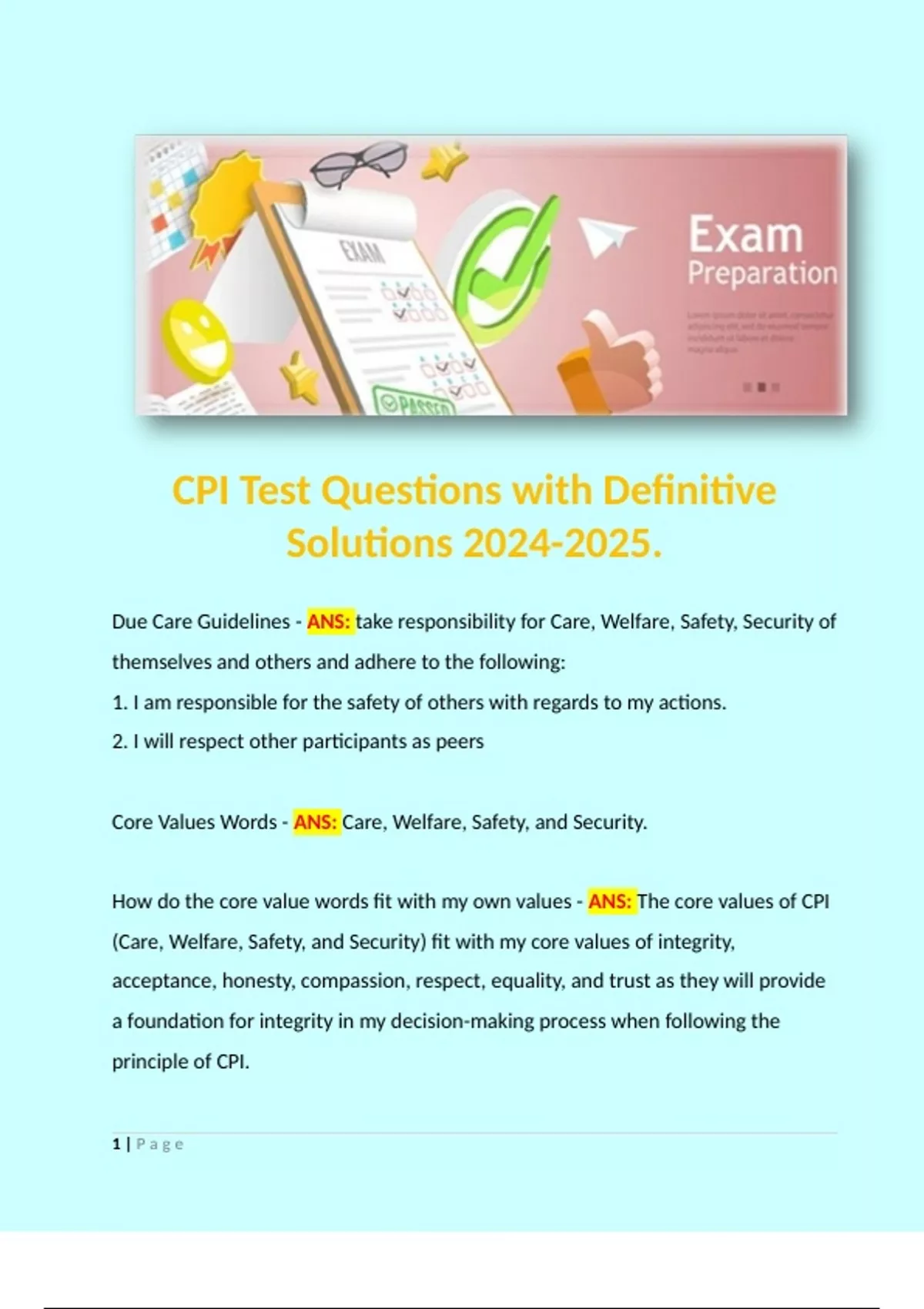 CPI Test Questions with Definitive Solutions . Contains Terms like: Due Care Guidelines - ANS: take responsibility for Care, Welfare, Safety, Security of themselves and others and adhere to the following: 1. I am responsible for the safety of others with regards to my actions. 2. I will respect other participants as peers Core Values Words - ANS: Care, Welfare, Safety, and Security. How do the core value words fit with my own values - ANS: The core values of CPI (Care, Welfare, Safety, and Security) fit with my core values of integrity, acceptance, honesty, compassion, respect, equality, and trust as they will provide a foundation for integrity in my decision-making process when following the principle of CPI.