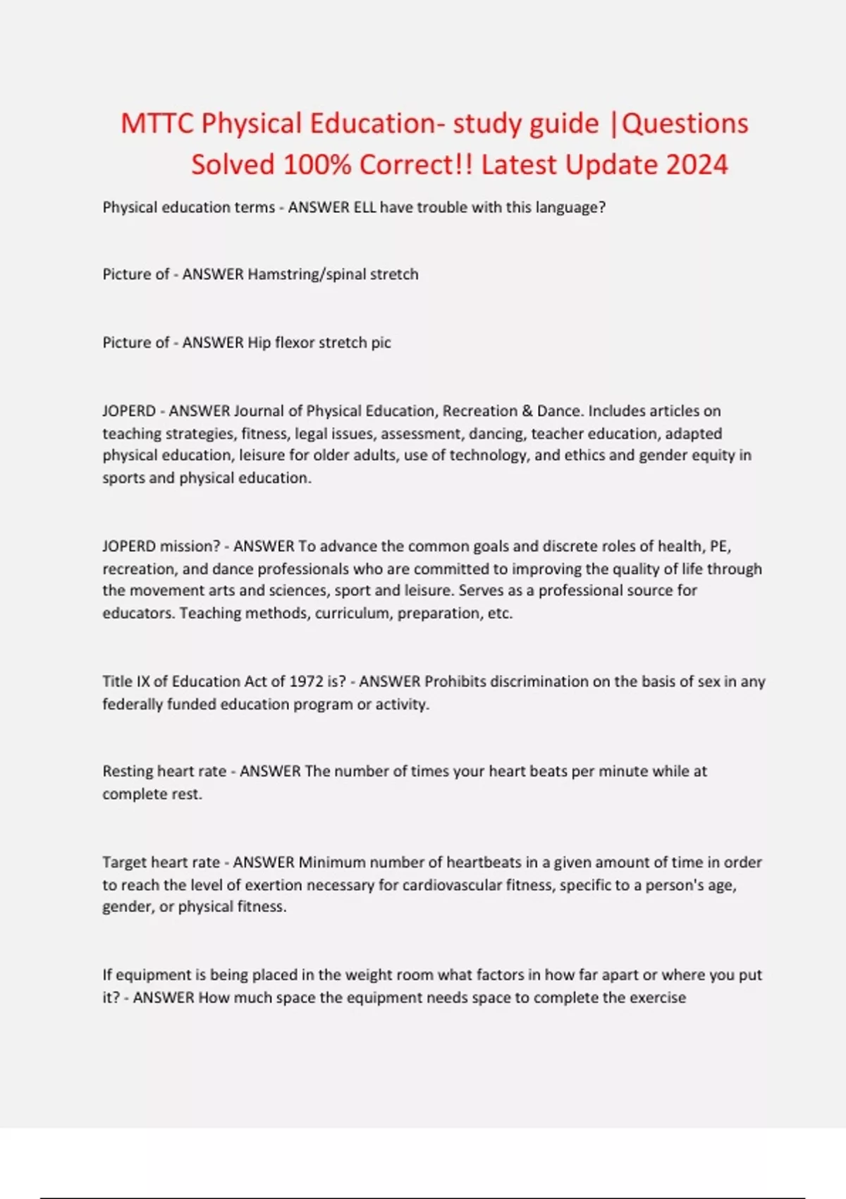 MTTC Physical Education- study guide |Questions Solved 100% Correct!! Latest Update 2024