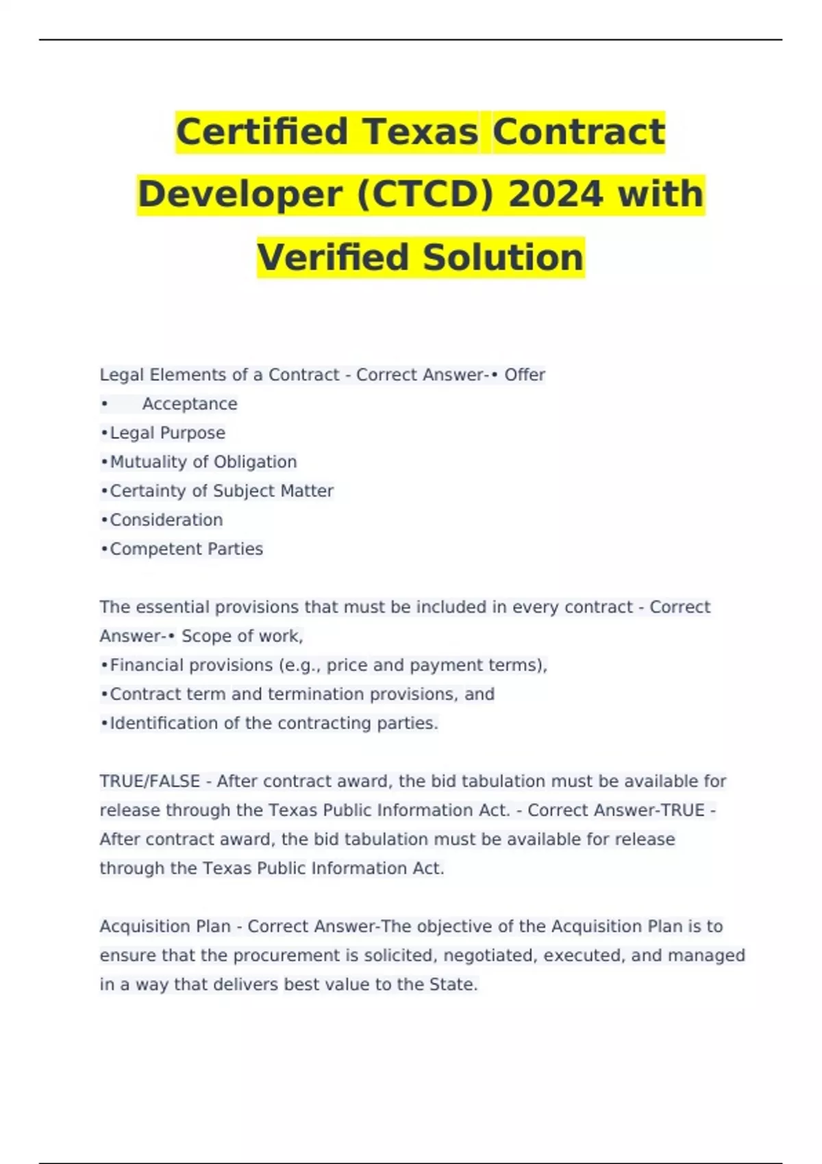 Certified Texas Contract Developer (CTCD) 2024 with Verified Solution Legal Elements of a Contract - Correct Answer-• Offer • Acceptance • Legal Purpose • Mutuality of Obligation • Certainty of Subject Matter • Consideration • Competent Parties The essential provisions that must be included in every contract - Correct Answer-• Scope of work, • Financial provisions (e.g., price and payment terms), • Contract term and termination provisions, and • Identification of the contracting parties.