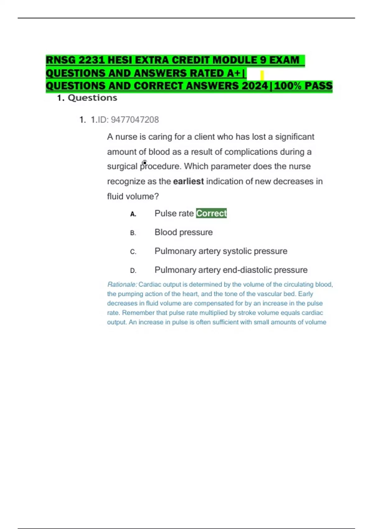 RNSG 2231 HESI EXTRA CREDIT MODULE 9 EXAM QUESTIONS AND ANSWERS RATED A+| QUESTIONS AND CORRECT ANSWERS 2024|100% PASS