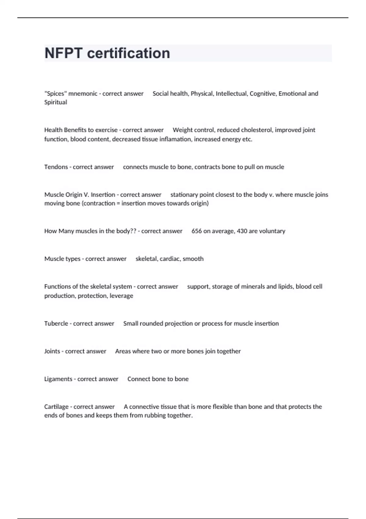 "Spices" mnemonic - correct answer Social health, Physical, Intellectual, Cognitive, Emotional and Spiritual Health Benefits to exercise - correct answer Weight control, reduced cholesterol, improved joint function, blood content, decreased tissue inflamation, increased energy etc. Tendons - correct answer connects muscle to bone, contracts bone to pull on muscle Muscle Origin V. Insertion - correct answer stationary point closest to the body v. where muscle joins moving bone (contraction = insertion moves towards origin) How Many muscles in the body?? - correct answer 656 on average, 430 are voluntary Muscle types - correct answer skeletal, cardiac, smooth Functions of the skeletal system - correct answer support, storage of minerals and lipids, blood cell production, protection, leverage Tubercle - correct answer Small rounded projection or process for muscle insertion Joints - correct answer Areas where two or more bones join together Ligaments - correct answer Connect bone to bone Cartilage - correct answer A connective tissue that is more flexible than bone and that protects the ends of bones and keeps them from rubbing together. synovial fluid - correct answer Secretion of synovial membranes that lubricates joints and nourishes articular cartilage heart - correct answer A hollow, muscular organ that pumps blood throughout the body. (also lungs) Arteries - correct answer carry blood away from the heart Veins - correct answer Blood vessels that carry blood back to the heart Capillaries - correct answer Microscopic vessel through which exchanges take place between the blood and cells of the body Respiratory System process - correct answer O2 through Nasal cavity or also buccal cavity--gases move into the pharynx--larynx--trachea (front tube)--left bronchus & right bronchus--smaller and smaller bronchiole passageways--end up in alveolar sacs Central Nervous System (CNS) - correct answer brain and spinal cord Peripheral Nervous System (PNS) - correct answer the sensory and motor neurons that connect the central nervous system (CNS) to the rest of the body. Digestive System Process - correct answer MOUTH (mechanical & chemical breakdown occurs by grinding food down & enzymes breakings down proteins, carbs & fats into nutrients) once swallowed the bolus of food passes through the -- ESOPHAGUS (bolus passes through here into the--STOMACH (cells in the stomach lining secrete mucus for lubrication, an enzyme begins protein digestion (protease) --SMALL INTESTINE (Absorption of nutrients occurs in here) Remaining products not digested goes through to the --LARGE INTESTINE ( also known colon, where absorption of water, affecting water & electrolyte balance, & the storage & formation of feces also occurs which is then disposed through to the-- ANUS Immune System defense mechanisms - correct answer Skin, linings of resp. and digestive passageways, blood clotting, white cells, thymus (t cells), lymph nodes pituitary gland - correct answer The endocrine system's most influential gland. Under the influence of the hypothalamus, the pituitary regulates growth and controls other endocrine glands. adrenal glands - correct answer a pair of endocrine glands that sit just above the kidneys and secrete hormones (epinephrine and norepinephrine) that help arouse the body in times of stress. pineal gland - correct answer secretes melatonin, sleep regulation integumentary system - correct answer skin, hair, nails Anterior (Ventral) - correct answer front of the body Posterior (dorsal) - correct answer back of body Superior - correct answer Higher on the body, nearer to the head Inferior - correct answer Lower on the body, farther from the head Proximal - correct answer Closer to the origin of the body part or the point of attachment of a limb to the body trunk Distal - correct answer farther from the origin of a body part or the point of attachment of a limb to the body trunk Medial - correct answer