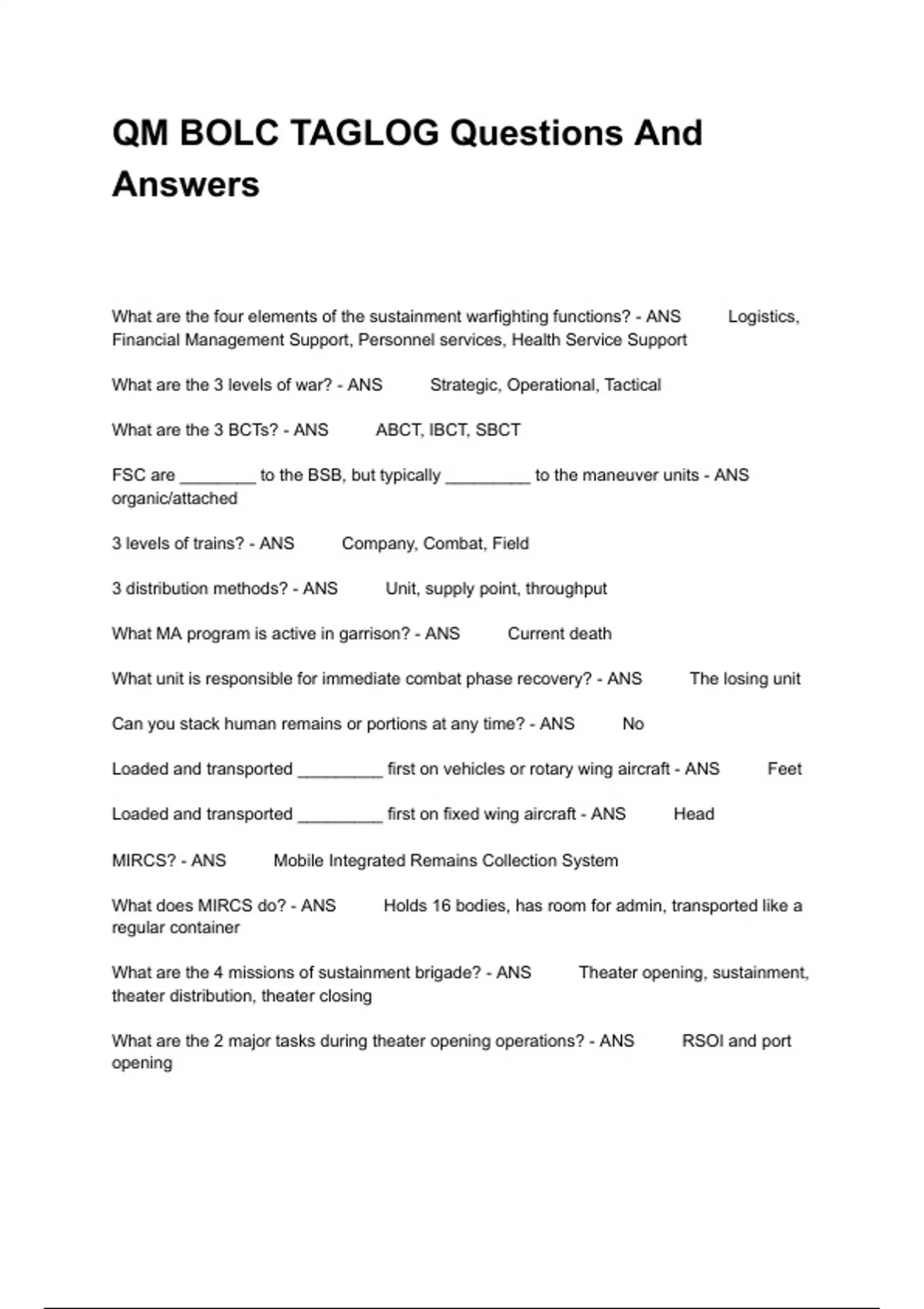 What are the four elements of the sustainment warfighting functions? - ANS Logistics, Financial Management Support, Personnel services, Health Service Support What are the 3 levels of war? - ANS Strategic, Operational, Tactical What are the 3 BCTs? - ANS ABCT, IBCT, SBCT FSC are ________ to the BSB, but typically _________ to the maneuver units - ANS organic/attached 3 levels of trains? - ANS Company, Combat, Field 3 distribution methods? - ANS Unit, supply point, throughput What MA program is active in garrison? - ANS Current death What unit is responsible for immediate combat phase recovery? - ANS The losing unit Can you stack human remains or portions at any time? - ANS No Loaded and transported _________ first on vehicles or rotary wing aircraft - ANS Feet Loaded and transported _________ first on fixed wing aircraft - ANS Head MIRCS? - ANS Mobile Integrated Remains Collection System What does MIRCS do? - ANS Holds 16 bodies, has room for admin, transported like a regular container What are the 4 missions of sustainment brigade? - ANS Theater opening, sustainment, theater distribution, theater closing What are the 2 major tasks during theater opening operations? - ANS RSOI and port opening What is the definition of theater closing? - ANS Redeployment of troops and equipment from a theater What is the only organic unit to a CSSB? - ANS HHC How many companies can a CSSB employ and control? - ANS 6 companies In a sustainment brigade, what type of battalion provides the distribution link between the DSA and BSA? - ANS CSSB Who is in charge of the BSA? - ANS BSB Commander (O-5) Which platoon receives CLIII and CLI at BSA? - ANS Fuel and water platoon, A co, 3D BSB 92F - ANS Fueler 92W - ANS Waterdog What form of defense does the BSA employ? - ANS Perimeter defense What are the 7 steps of engagement area development? - ANS 1. ID all likely enemy avenues of approach 2. Determine likely enemy schemes of maneuver 3. Determine where to kill the enemy 4. Emplace weapons systems 5. Plan and integrate obstacles 6. Plan and integrate indirect fires 7. Rehearse the operation in the engagement area What are two of the most important factors in a BSA site selection? - ANS Mission accomplishment and survivability Who makes the call to displace the BSA? - ANS BSB Commander, talks with the BCT Commander Why are ATHPs typically outside of the BSA? - ANS due to net explosive weight of the ammunition there needs to be a significant stand off distance with personnel, equipment, and supply points When displacing the BSA, what is the FLE used for? - ANS A FLE enables the BSB to continue uninterrupted support to the BCT while relocating What company in the BSA do you posture against the most threatening avenue of approach? - ANS B co (BSB)