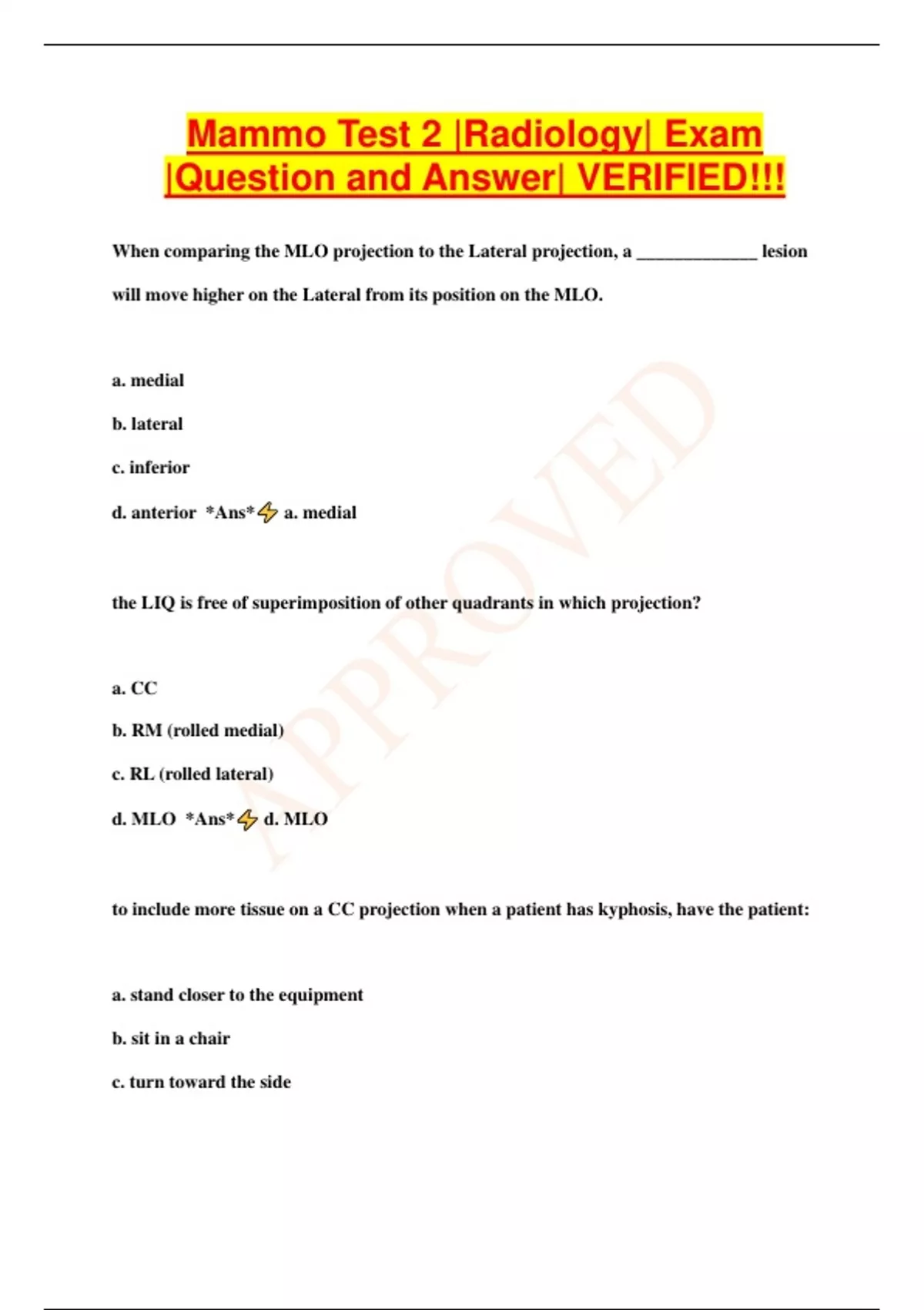 Mammo Test 2 |Radiology| Exam |Question and Answer| VERIFIED!!! When comparing the MLO projection to the Lateral projection, a _____________ lesion will move higher on the Lateral from its position on the MLO. a. medial b. lateral c. inferior d. anterior *Ans* a. medial the LIQ is free of superimposition of other quadrants in which projection? a. CC b. RM (rolled medial) c. RL (rolled lateral) d. MLO *Ans* d. MLO to include more tissue on a CC projection when a patient has kyphosis, have the patient: a. stand closer to the equipment b. sit in a chair c. turn toward the side d. hold both arms overhead *Ans* b. sit in a chair the ipsilateral arm should be ___________ to the body when obtaining the MLO projection. a. over the head b. perpendicular c. at the side d. held behind the back *Ans* b. perpendicular radial scars are related to surgical scars. true or false? *Ans* false ________ imaging is the technique of performing additional overlapping images to visualize all of the tissues. *Ans* mosaic pathology in a male is generally located __________ to the nipple. a. anterior b. superior c. posterior d. inferior *Ans* c. posterior inverted nipples definitely indicate cancer. true or false *Ans* false an added ________ view may be helpful to view the extreme lateral tissue in a patient with "wrap-around" breasts. *Ans* XCCL two examples of chestwall deformities that present imaging challenges are: a. pectus excavatum and pectus carinatum b. pectus excalcium and pectus keratosis c. sternal novartis and sternal peritosis d. sternal fixation and pectus immobilis *Ans* a. pectus excavatu