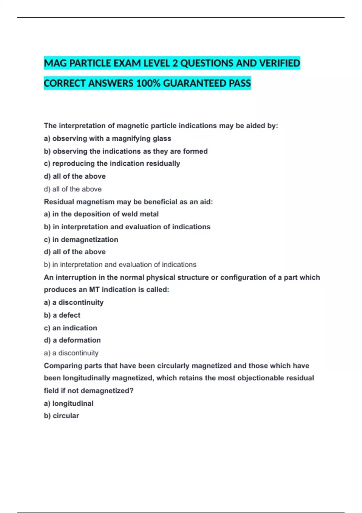 MAG PARTICLE EXAM LEVEL 2 QUESTIONS AND VERIFIED CORRECT ANSWERS 100% GUARANTEED PASS