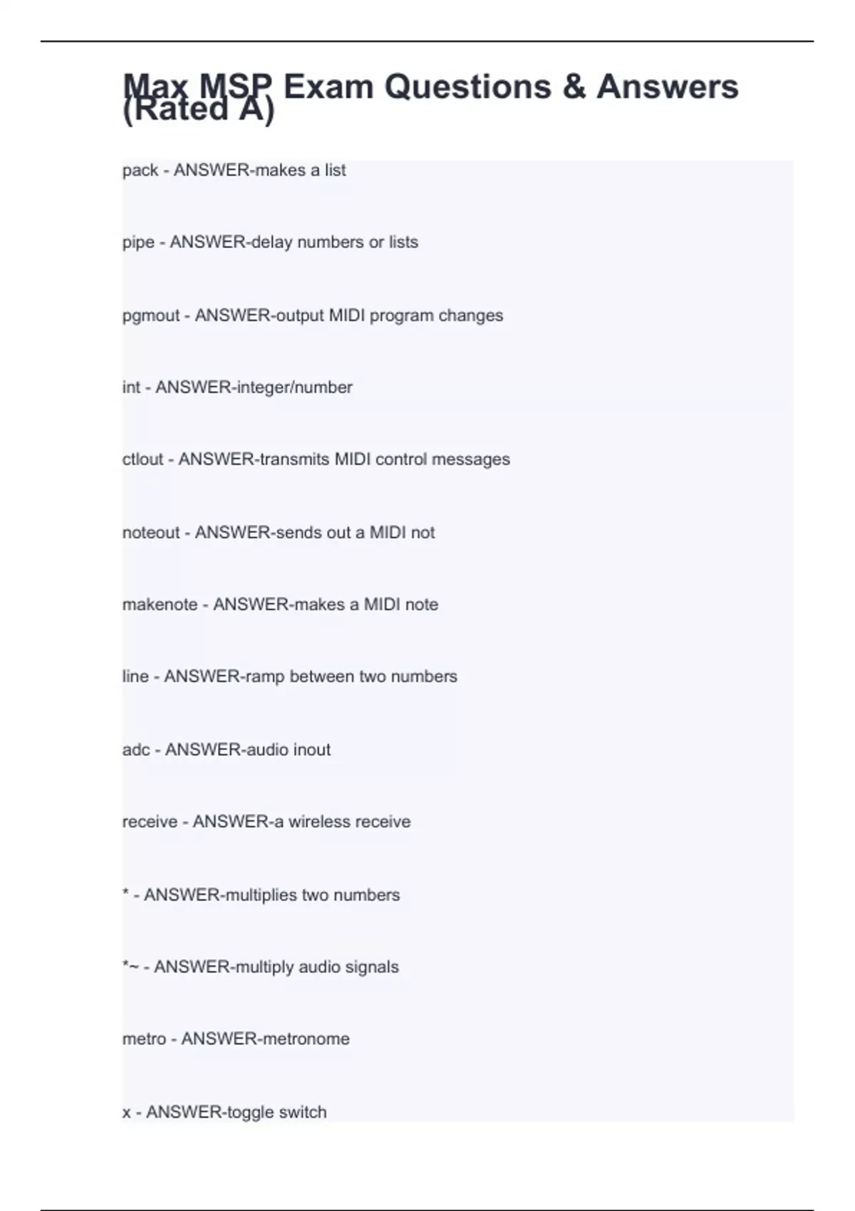 pack - ANSWER-makes a list pipe - ANSWER-delay numbers or lists pgmout - ANSWER-output MIDI program changes int - ANSWER-integer/number ctlout - ANSWER-transmits MIDI control messages noteout - ANSWER-sends out a MIDI not makenote - ANSWER-makes a MIDI note line - ANSWER-ramp between two numbers adc - ANSWER-audio inout receive - ANSWER-a wireless receive * - ANSWER-multiplies two numbers *~ - ANSWER-multiply audio signals
