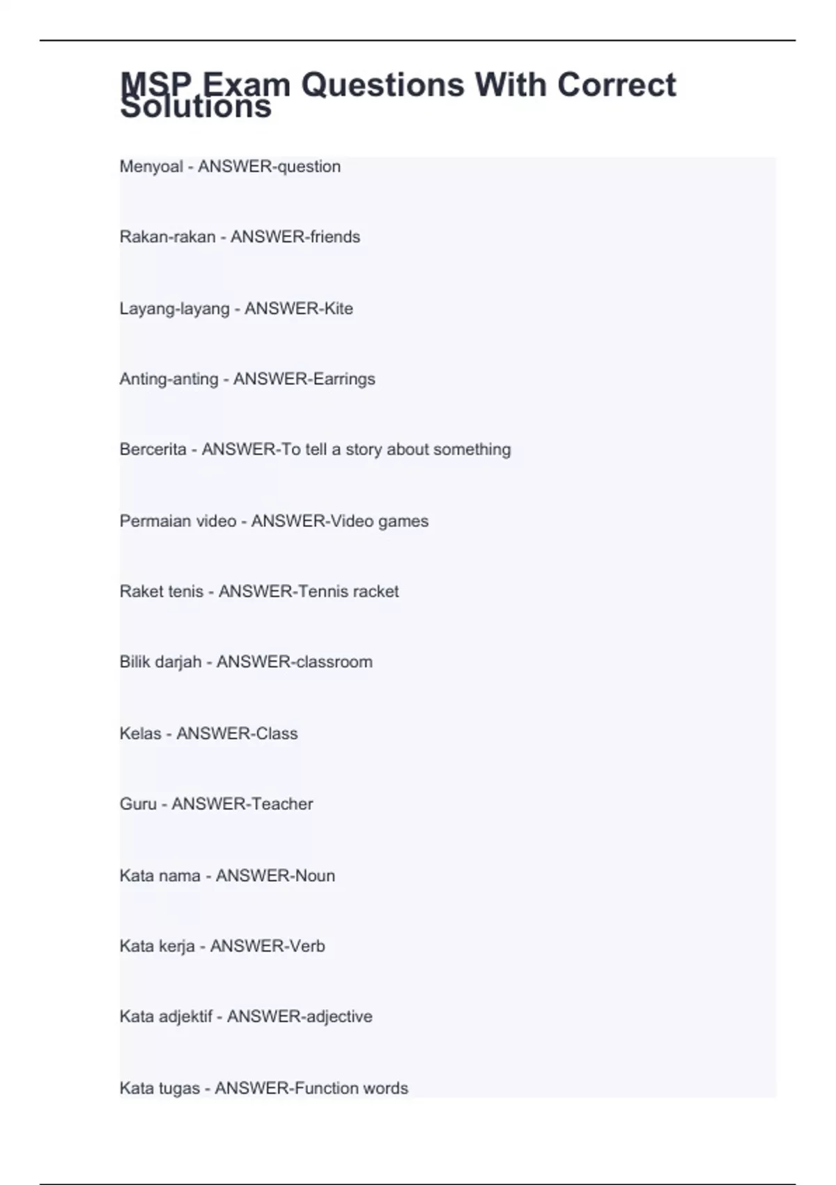 Menyoal - ANSWER-question Rakan-rakan - ANSWER-friends Layang-layang - ANSWER-Kite Anting-anting - ANSWER-Earrings Bercerita - ANSWER-To tell a story about something Permaian video - ANSWER-Video games Raket tenis - ANSWER-Tennis racket Bilik darjah - ANSWER-classroom Kelas - ANSWER-Class Guru - ANSWER-Teacher Kata nama - ANSWER-Noun Kata kerja - ANSWER-Verb