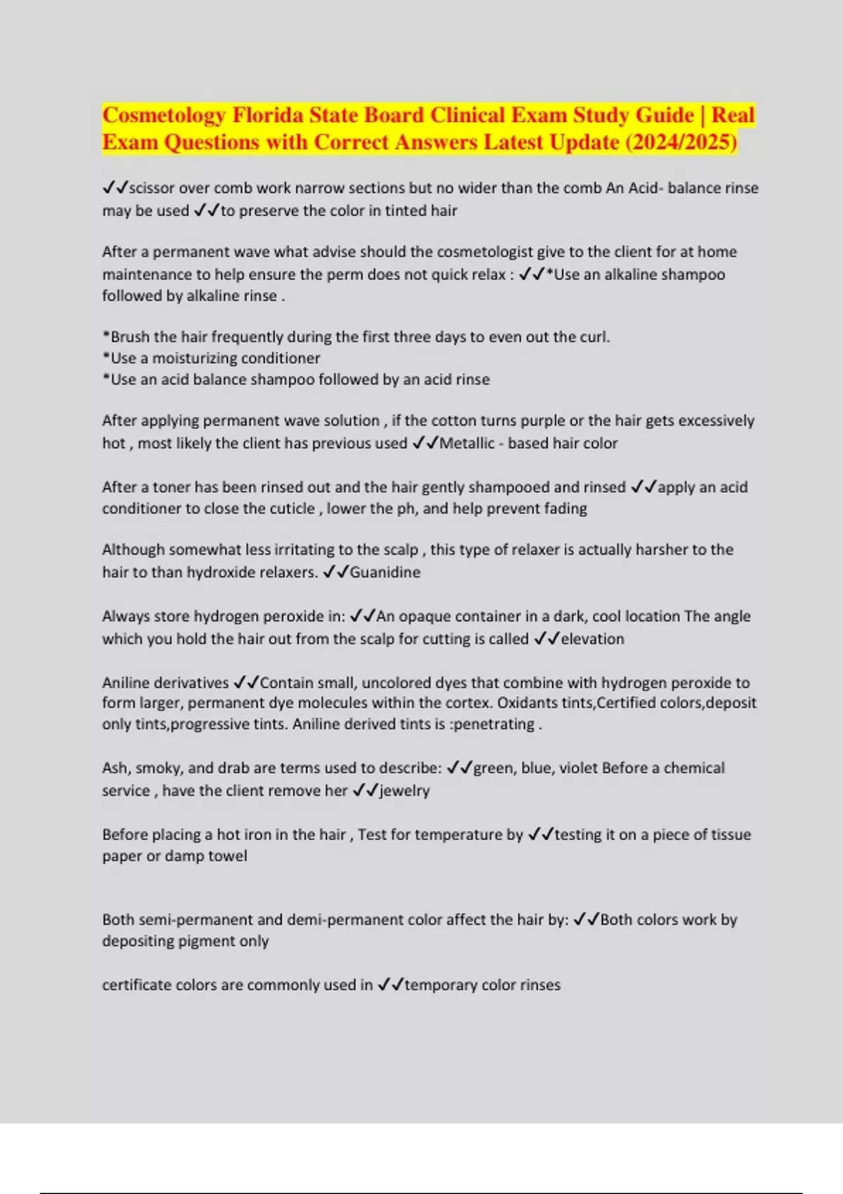 Cosmetology Florida State Board Clinical Exam Study Guide | Real Exam Questions with Correct Answers Latest Update (2024/2025)