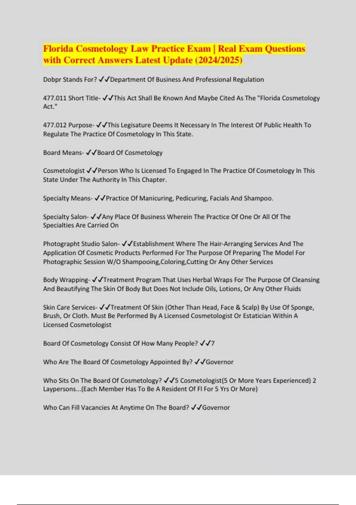 Florida Cosmetology Law Practice Exam | Real Exam Questions with Correct Answers Latest Update (2024/2025)