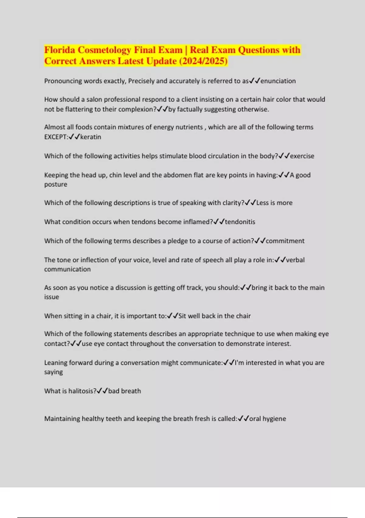 Florida Cosmetology Final Exam | Real Exam Questions with Correct Answers Latest Update (2024/2025)