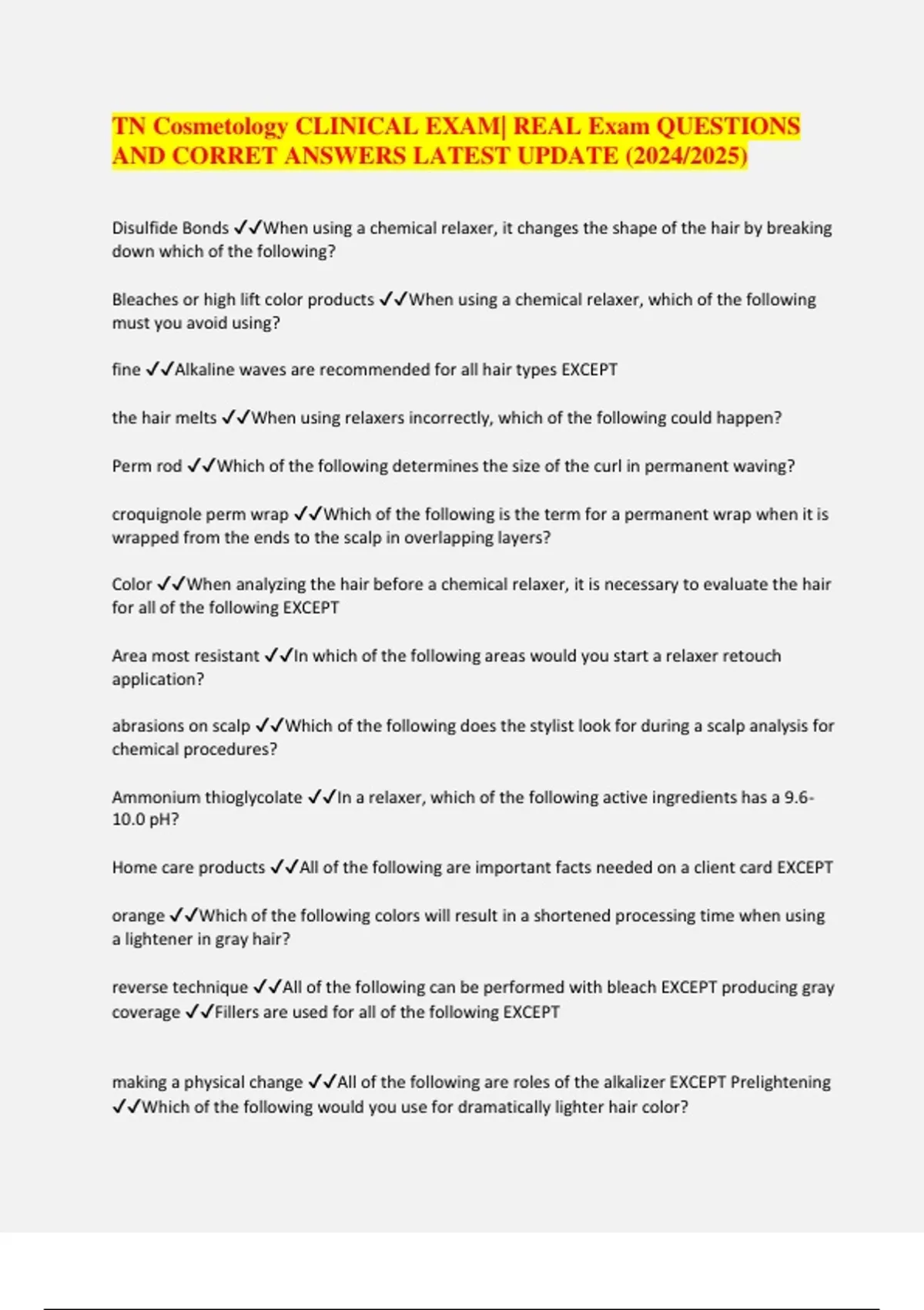 TN Cosmetology CLINICAL EXAM| REAL Exam QUESTIONS AND CORRET ANSWERS LATEST UPDATE (2024/2025)