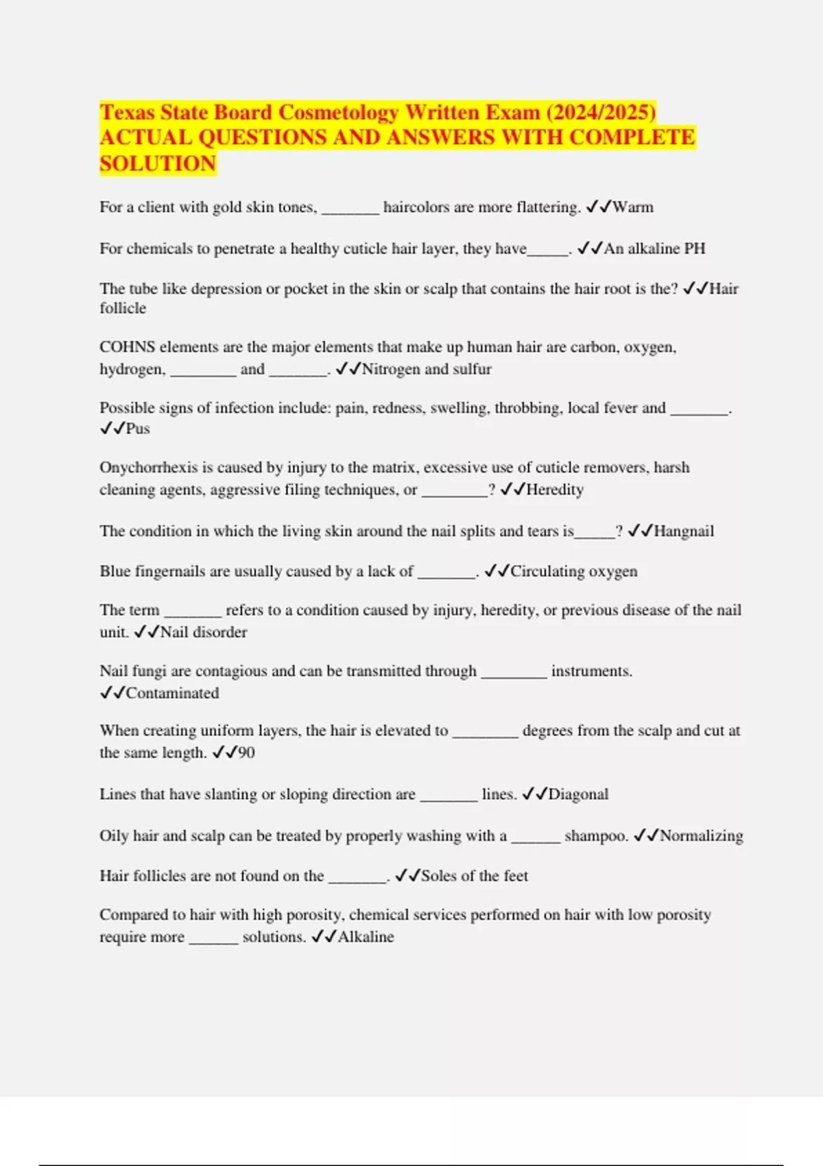 Texas State Board Cosmetology Written Exam (2024/2025) ACTUAL QUESTIONS AND ANSWERS WITH COMPLETE SOLUTION
