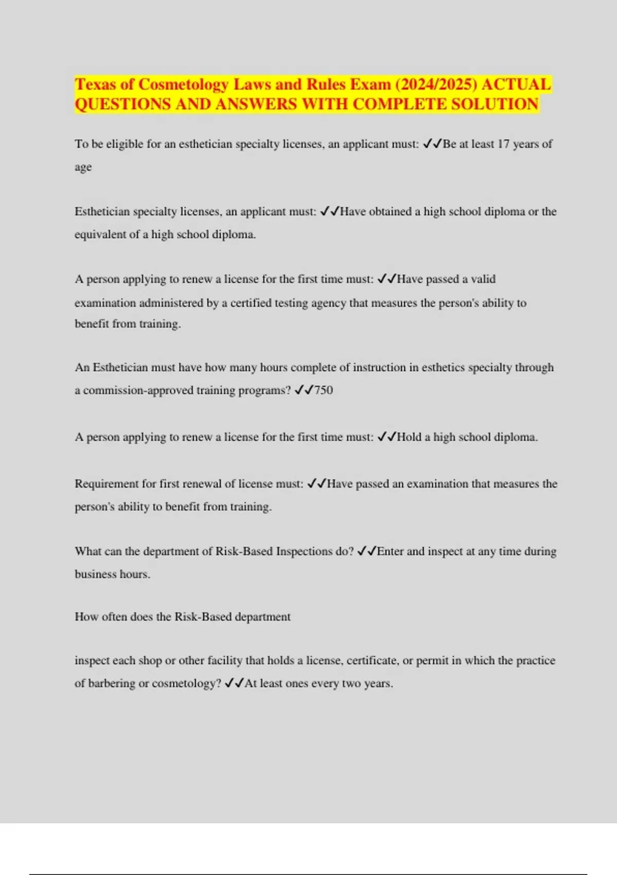 Texas of Cosmetology Laws and Rules Exam (2024/2025) ACTUAL QUESTIONS AND ANSWERS WITH COMPLETE SOLUTION