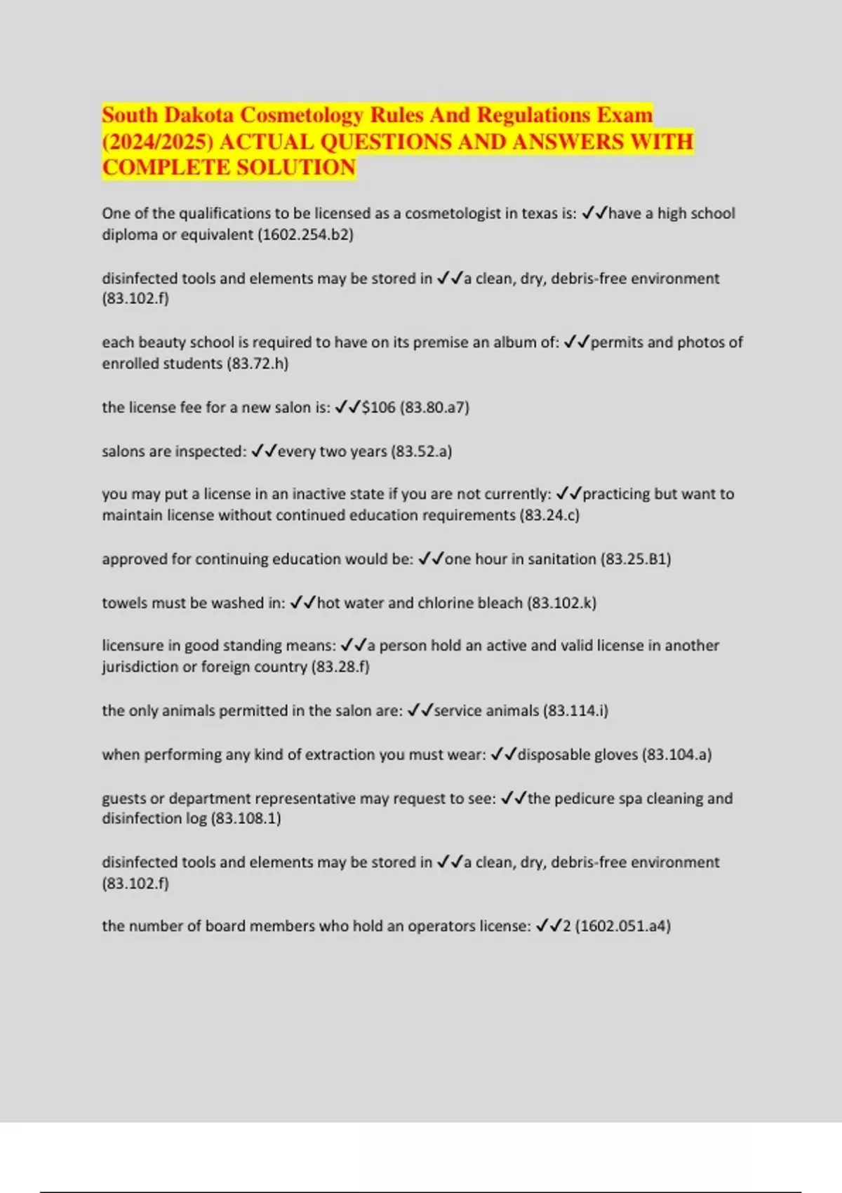 South Dakota Cosmetology Rules And Regulations Exam (2024/2025) ACTUAL QUESTIONS AND ANSWERS WITH COMPLETE SOLUTION