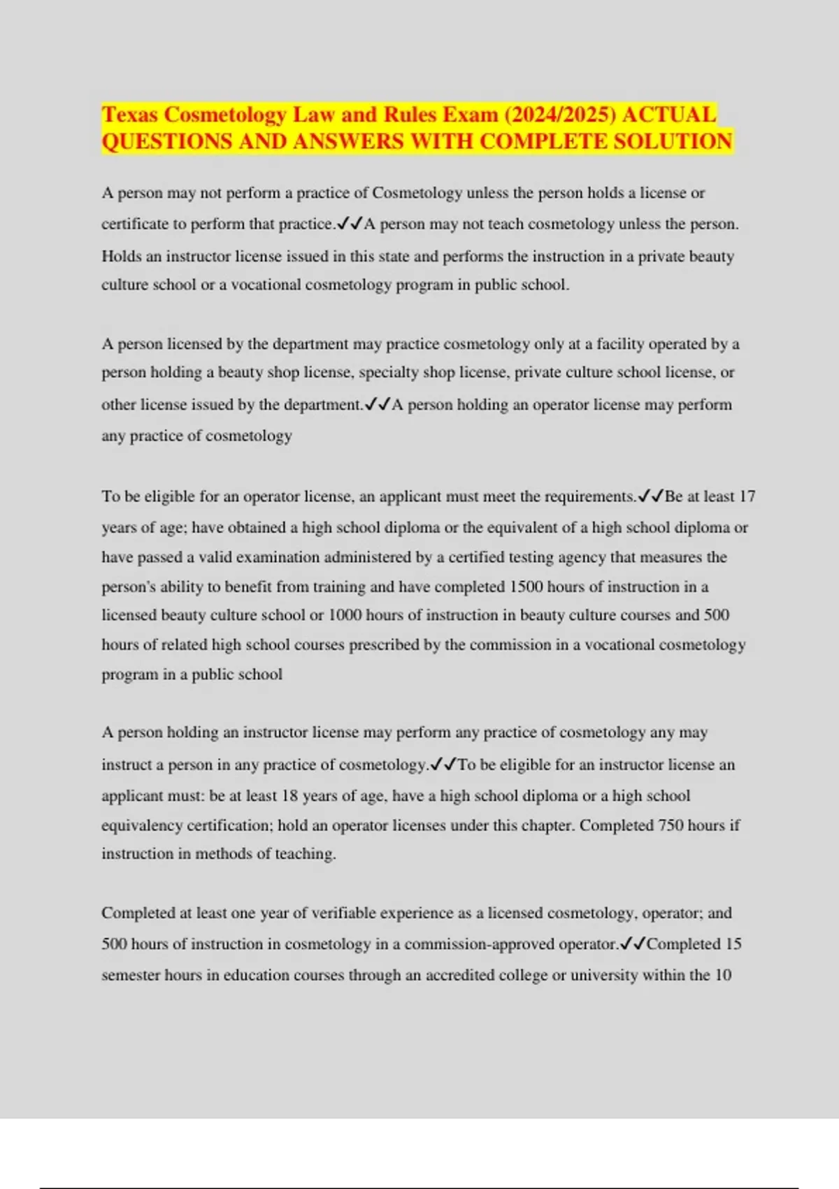 Texas Cosmetology Law and Rules Exam (2024/2025) ACTUAL QUESTIONS AND ANSWERS WITH COMPLETE SOLUTION