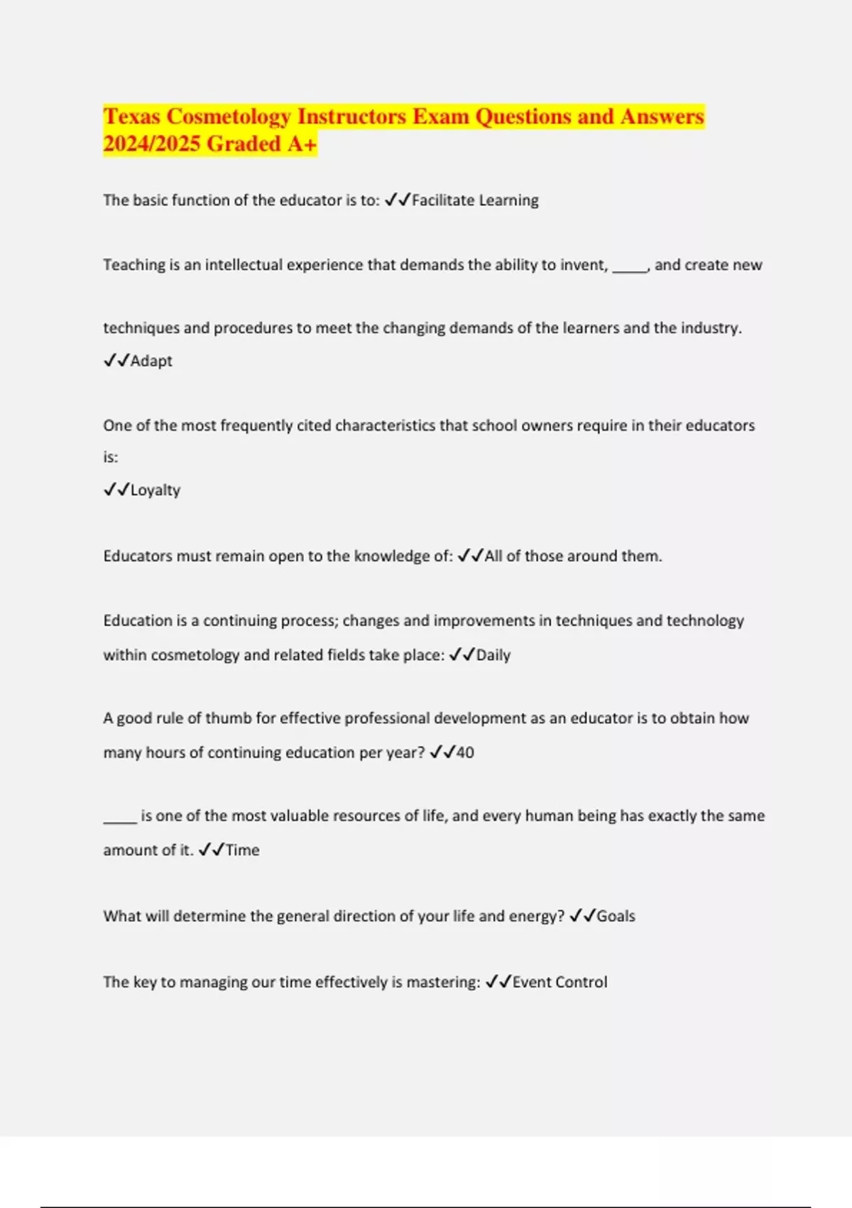 Texas Cosmetology Instructors Exam Questions and Answers 2024/2025 Graded A+