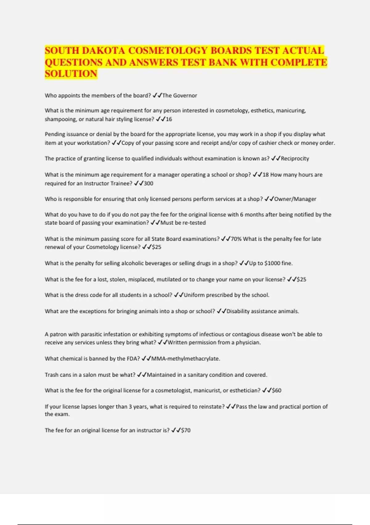 SOUTH DAKOTA COSMETOLOGY BOARDS TEST ACTUAL QUESTIONS AND ANSWERS TEST BANK WITH COMPLETE SOLUTION