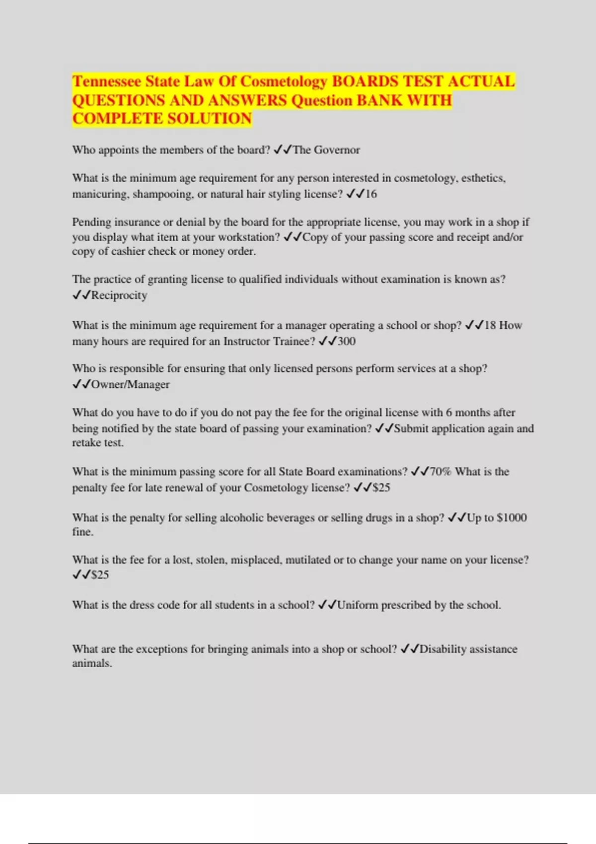 Tennessee State Law Of Cosmetology BOARDS TEST ACTUAL QUESTIONS AND ANSWERS Question BANK WITH COMPLETE SOLUTION
