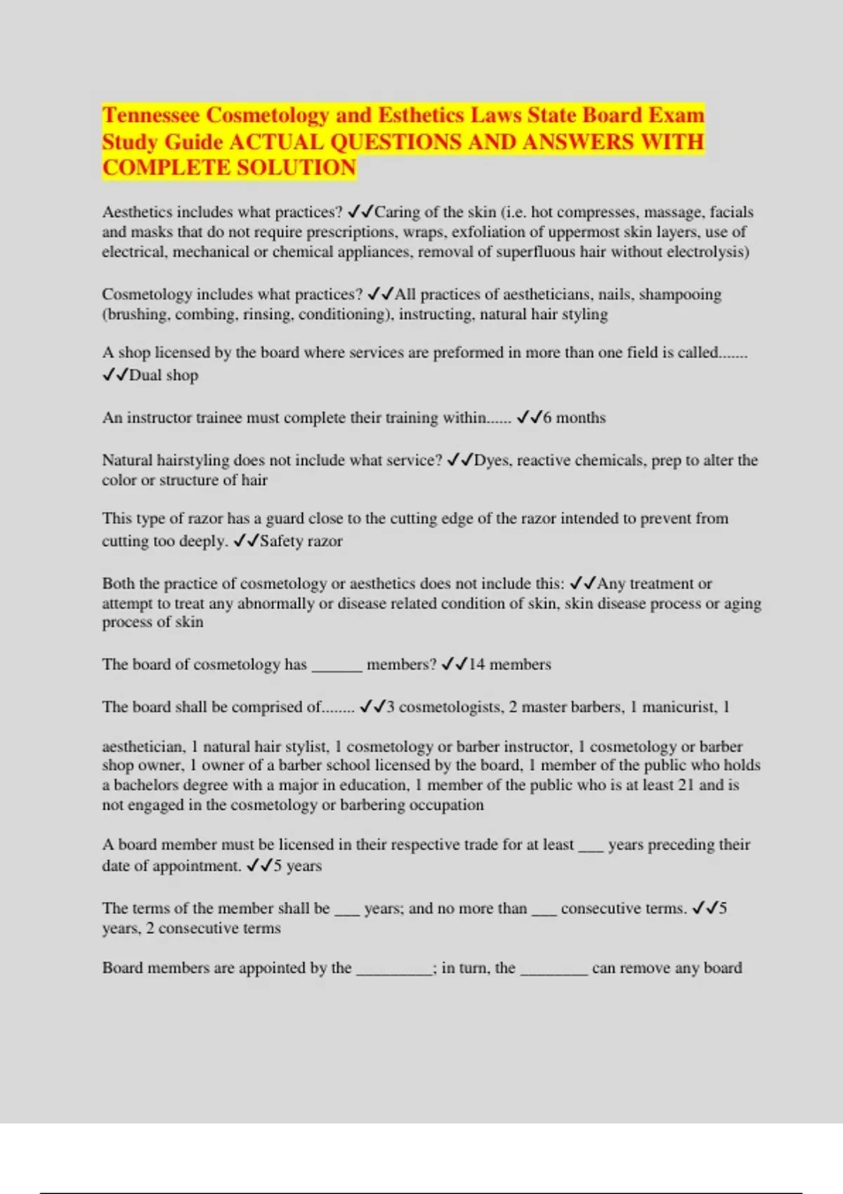 Tennessee Cosmetology and Esthetics Laws State Board Exam Study Guide ACTUAL QUESTIONS AND ANSWERS WITH COMPLETE SOLUTION