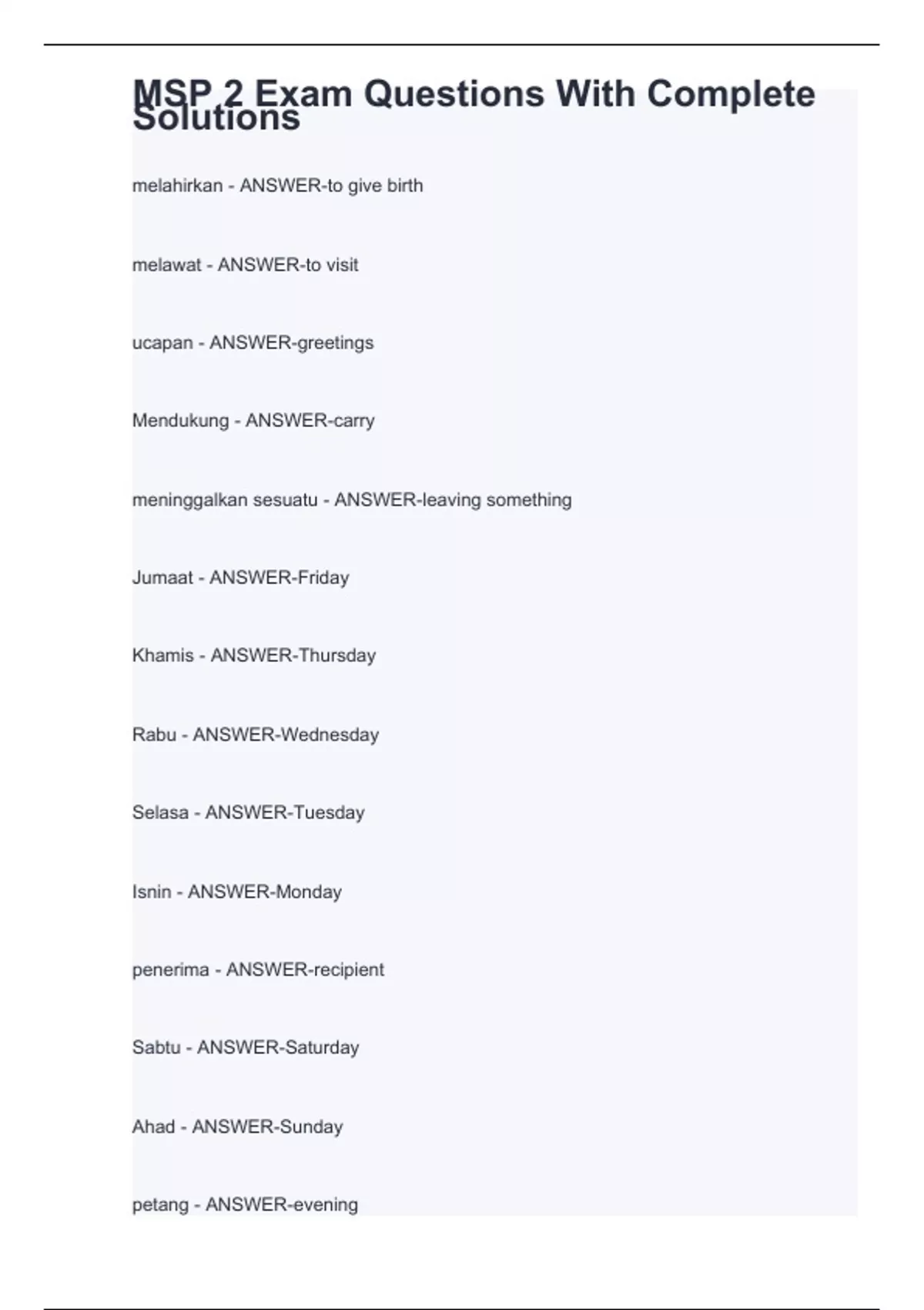 melahirkan - ANSWER-to give birth melawat - ANSWER-to visit ucapan - ANSWER-greetings Mendukung - ANSWER-carry meninggalkan sesuatu - ANSWER-leaving something Jumaat - ANSWER-Friday Khamis - ANSWER-Thursday Rabu - ANSWER-Wednesday Selasa - ANSWER-Tuesday Isnin - ANSWER-Monday penerima - ANSWER-recipient Sabtu - ANSWER-Saturday