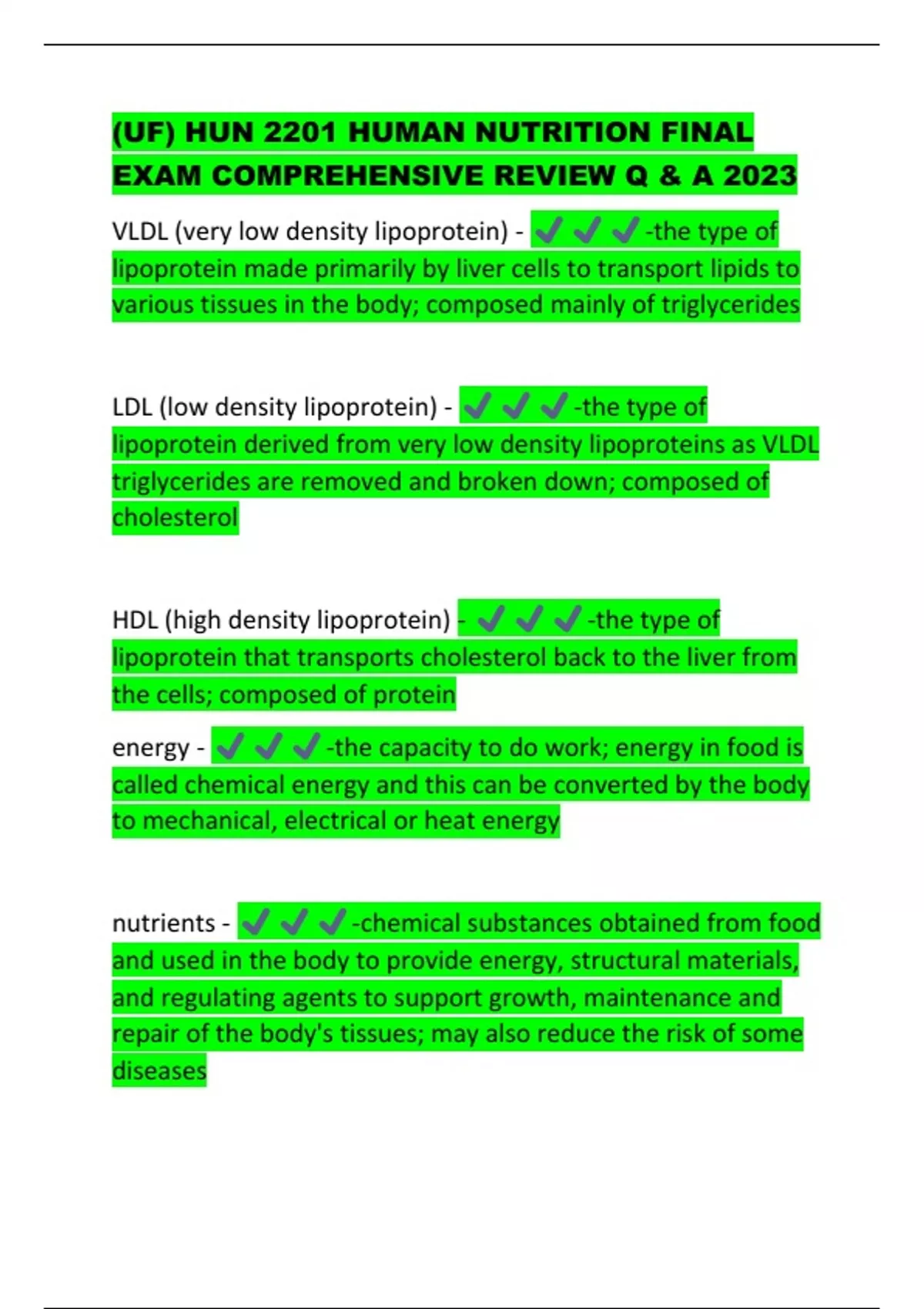 (UF) HUN 2201 HUMAN NUTRITION FINAL EXAM COMPREHENSIVE REVIEW Q & A 2023 VLDL (very low density lipoprotein) - -the type of lipoprotein made primarily by liver cells to transport lipids to various tissues in the body; composed mainly of triglycerides L