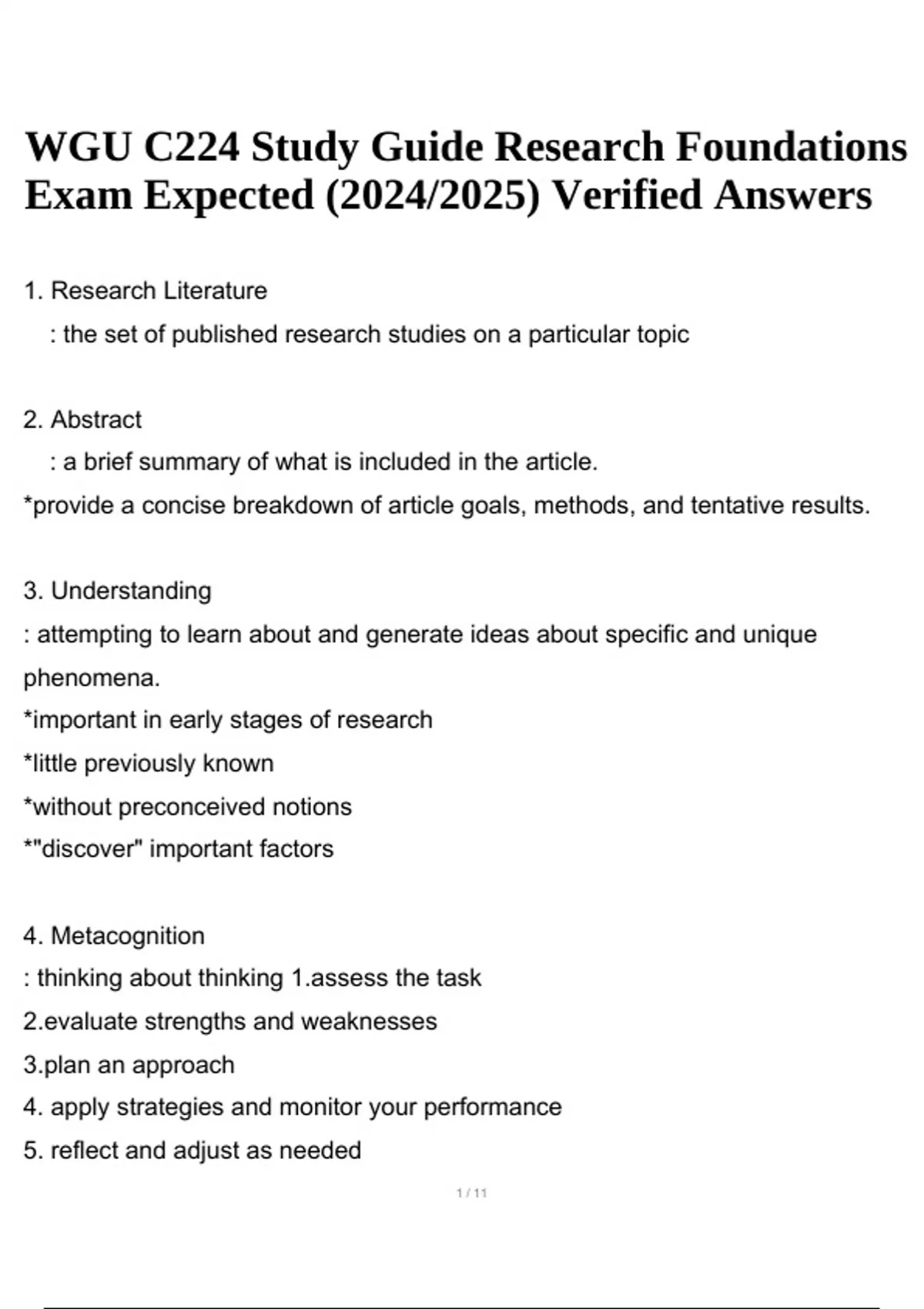 WGU C224 Study Guide Research Foundations Exam Expected (2024/2025) Verified Answers. 1. Research Literature : the set of published research studies on a particular topic 2. Abstract : a brief summary of what is included in the article. *provide a concise breakdown of article goals, methods, and tentative results. 3. Understanding : attempting to learn about and generate ideas about specific and unique phenomena. *important in early stages of research *little previously known *without preconceived notions *"discover" important factors 4. Metacognition : thinking about thinking s the task ate strengths and weaknesses an approach 4. apply strategies and monitor your performance 5. reflect and adjust as needed WGU C224 Study Guide Research Foundations Exam Expected (2024/2025) Verified Answers 2 / 11 Repeat the steps as a cycle. 5. Description : an attempt to describe the characteristics of a phenomenon. *describing a phenomenon? *documenting characteristics of phenomenon? 6. Decriptive Research : provide an accurate description or picture of the status or characteristics of a situation or phenomenon *deeper level than description 1. randomly selected from defined population mine the sample characteristics the characteristics of the population based on the sample 7. Explanation : researchers attempt to show how and why a phenomenon operates as it does. op a theory about how and why the phenomenon operates as it does ify the cause and effect relationships 8. explanatory research : testing hypotheses and theories that explain the functions of a phenomenon in detail *strongest form of explanatory research for providing evidence of cause and effect 9. Prediction 3 / 11 : forecast a phenomenon, wherin there is an association made be- tween two points in a time *can be made from research studies 10. predictive research : predict the future status of one or more dependent (or criterion) variables on the basis of one or more independent (or predictor) variables.