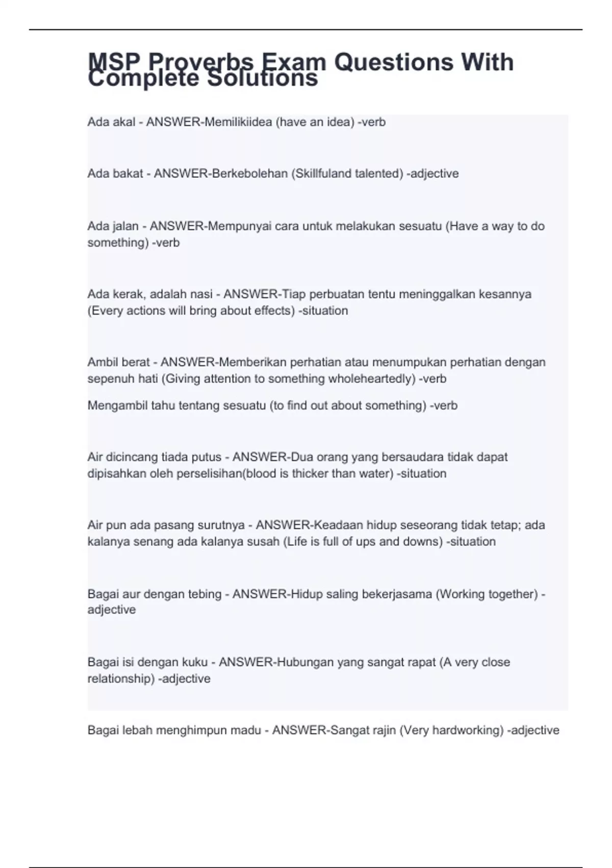 MSP Proverbs Exam Questions With Complete Solutions Ada akal - ANSWER-Memilikiidea (have an idea) -verb