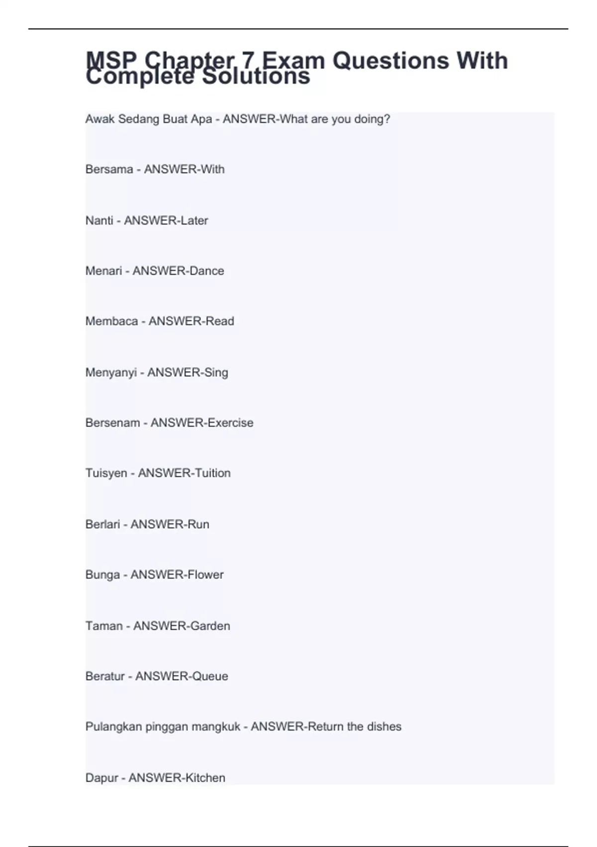Awak Sedang Buat Apa - ANSWER-What are you doing? Bersama - ANSWER-With Nanti - ANSWER-Later Menari - ANSWER-Dance Membaca - ANSWER-Read Menyanyi - ANSWER-Sing Bersenam - ANSWER-Exercise Tuisyen - ANSWER-Tuition Berlari - ANSWER-Run Bunga - ANSWER-Flower Taman - ANSWER-Garden Beratur - ANSWER-Queue