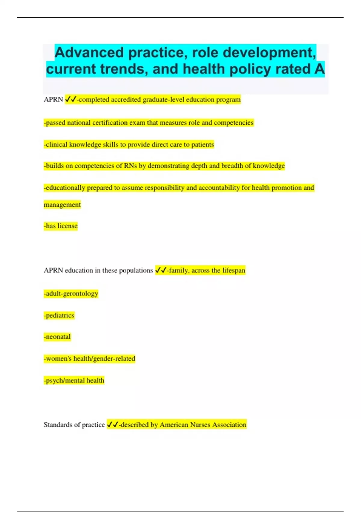 Advanced practice, role development, current trends, and health policy rated A
