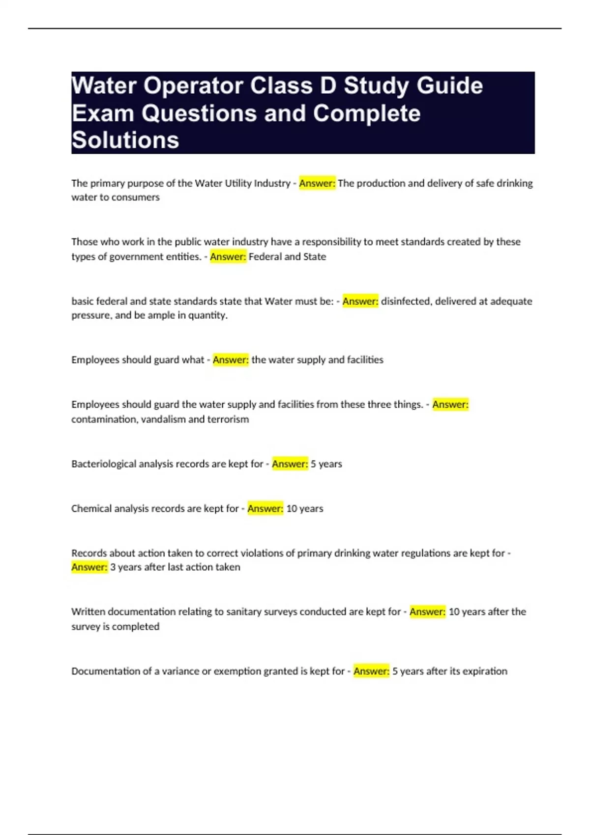 Water Operator Class D Study Guide Exam Questions and Complete Solutions