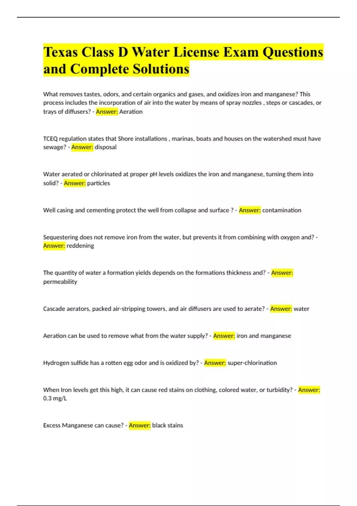 Texas Class D Water License Exam Questions and Complete Solutions.