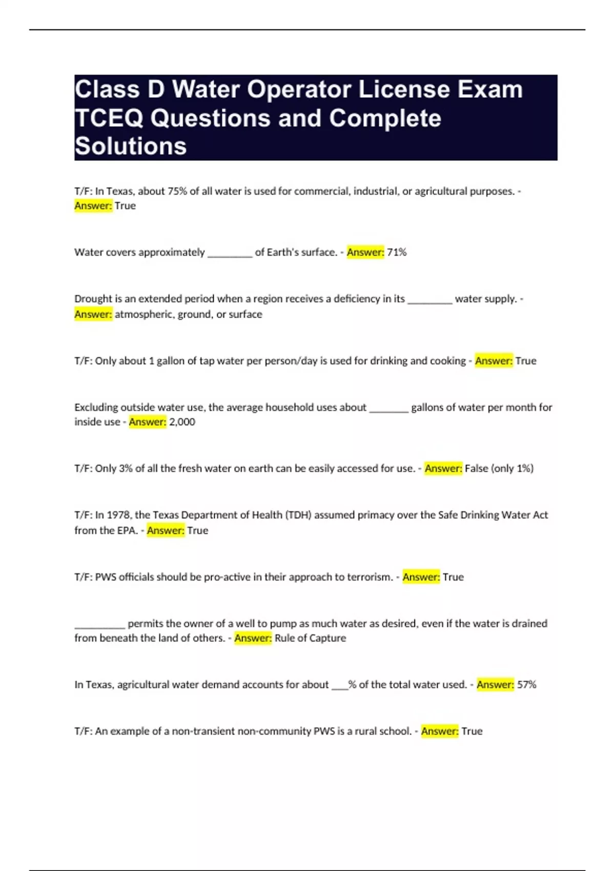 Class D Water Operator License Exam TCEQ Questions and Complete Solutions