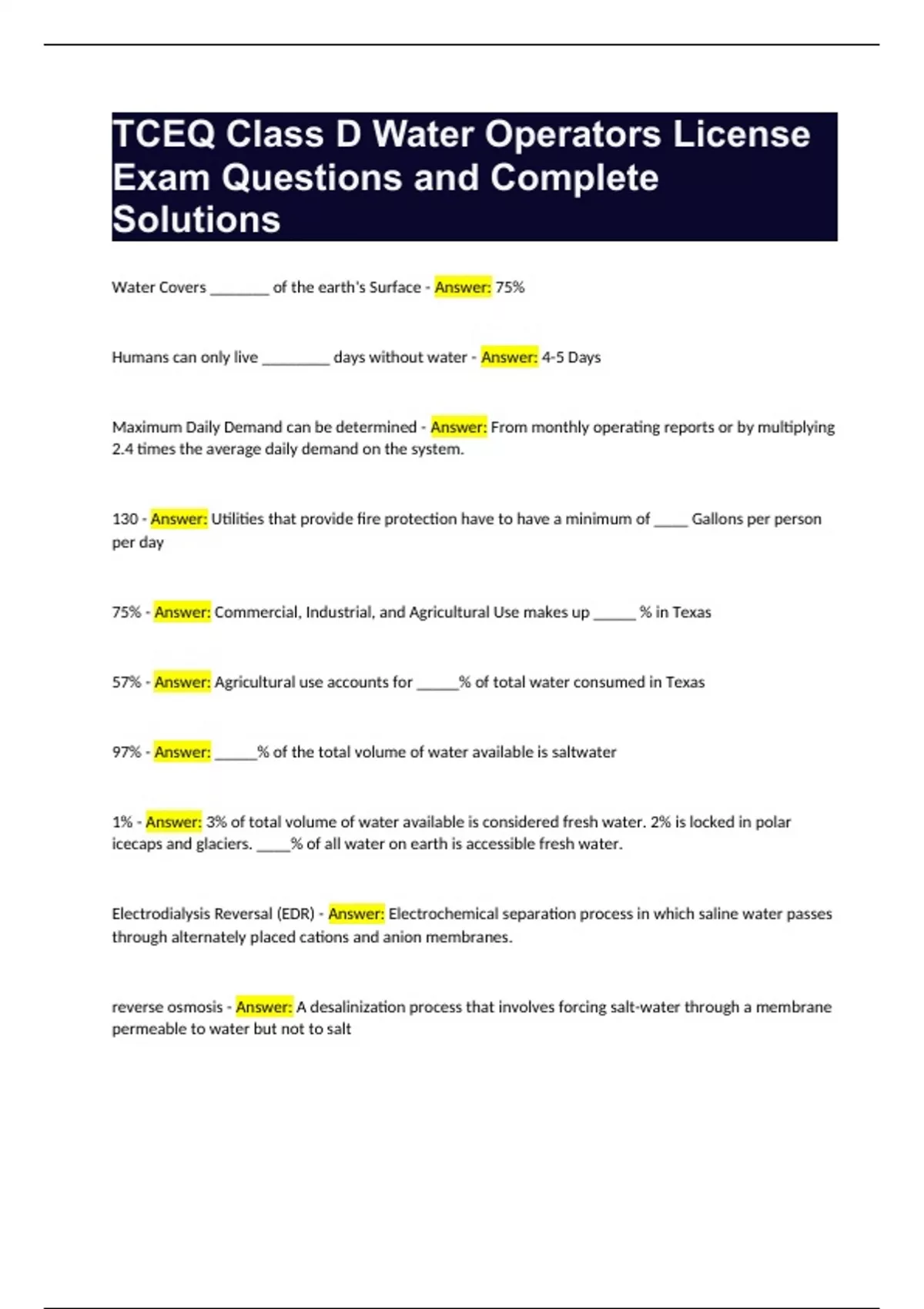 TCEQ Class D Water Operators License Exam Questions and Complete Solutions Water Covers _______ of the earth's Surface - Answer: 75% Humans can only live ________ days without water - Answer: 4-5 Days Maximum Daily Demand can be determined - Answer: From monthly operating reports or by multiplying 2.4 times the average daily demand on the system. 130 - Answer: Utilities that provide fire protection have to have a minimum of ____ Gallons per person per day 75% - Answer: Commercial, Industrial, and Agricultural Use makes up _____ % in Texas 57% - Answer: Agricultural use accounts for _____% of total water consumed in Texas 97% - Answer: _____% of the total volume of water available is saltwater 1% - Answer: 3% of total volume of water available is considered fresh water. 2% is locked in polar icecaps and glaciers. ____% of all water on earth is accessible fresh water. Electrodialysis Reversal (EDR) - Answer: Electrochemical separation process in which saline water passes through alternately placed cations and anion membranes. reverse osmosis - Answer: A desalinization process that involves forcing salt-water through a membrane permeable to water but not to salt 2000 - Answer: Excluding outside use, the average household uses about _____ gallons of water per month on inside use True - Answer: True or False: only about 1 gallon of tap water per person/day is used for drinking and cooking demand - Answer: Monitoring average and maximum daily water _____ enables us to plan ahead for growth. potable - Answer: suitable for drinking Safe Drinking Water Act (1974) - Answer: The federal regulation of drinking water is done by the U.S. Environmental Protection Agency (EPA), which sets the drinking water quality standards and enforces this standards through a federal law known as the Public Water System - Answer: Providing the public water for human consumption through pipes or other constructed conveyances Requirements of a public water system - Answer: 1. Have at least 15 service connections or 2. Serve at least 25 individuals at least 60 days out of the year. Community - Answer: System has potential to serve at least 15 residential service connections on a year-round basis or serve at least 25 full time residents on a year round basis. nontransient noncommunity - Answer: System serves at least 25 of the SAME people who do not live at that location at least 6 months out of the year. Transient non-community - Answer: Public water system serves at least 25 persons of a transient nature at least 60 days out of the year. 2 years - Answer: Records Kept Required: amount of chemicals used, volume of water treated, complaint log, dead-end line flushing, cleaning records of water storage tanks 3 years - Answer: Records Kept Required: notices of violation, public notices, distribution disinfectant residual tests, turbidity monitoring results, instrument calibration records, back flow prevention assembling testing forms 5 years - Answer: Records Kept Required: microbiological analysis results, water storage tank inspection reports, consumer confidence reports or CCR 10 years - Answer: Chemical analysis of treated water, monthly operating report MOR , sanitary survey inspection reports CCI, customer service inspection records percolate - Answer: To drip into the ground recharging aquifers 15 - Answer: The state recommends ________ color units or less for drinking water. deeper - Answer: The _______ the well, the warmer the water heavier - Answer: Cold water is _________ than warm water Turbidity - Answer: Suspended matter in water 0.3 NTU or less at least 95% of the time. Can never exceed 1.0 NTU. - Answer: TCEQ requires a combined filter effluent (CFE) turbidity of Hardness - Answer: Dissolved salts of calcium and magnesium cause ______ in water True - Answer: True/False: The threshold odor number (TON) relates to the number of dilutions needed for the water to be tasteless 3 - Answer: The state recommends a TON of _______ or less interchangeable - Answer: The terms mg/L and ppm are ________ Total Coliform group - Answer: To avoid having to test a water sample for all diseases, a certain group of bacteria is used to indicate the possible presence of a pathogen - THE _____ >10 mg/l ; >1 mg/L - Answer: Levels of Nitrate and Nitrite that put infants under 6 months of age and pregnant women at risk of "blue baby" syndrome. (0.8 to 1.0 mg/L) - Answer: Optimum concentration of Fluoride 0.015 / 1.3 - Answer: The action level for lead is _______ Mg/L and for copper it is ________ Mg/L 0.2 mg/L - Answer: A minimum free chlorine residual of ___ mg/L is required 0.5 Mg/L - Answer: A minimum combined/total residual of ____ mg/L is required 4.0 Mg/L - Answer: Residual shall not surpass ______ Mg/L 40 - Answer: The maximum sustained gas withdrawal rate for a pressure transmission 150 pound cylinder is about ______ pounds per day 335 lbs per day - Answer: Maximum sustained pressure transmission rate for a ton cylinder is about____ 9;20 - Answer: Texas has _____ major and _____ minor aquifers which supply about 56% of the freshwater, about 80% of Irrigiation water and serve about 1/2 of the states population 50 feet - Answer: No public well site Can be within _____ feet of live stock in pastures or within _____ feet of a tile or concrete sanitary sewer 150 feet - Answer: No public Wells Sight can be within ____ feet of a septic tank drainfield, OSSF spray irrigation, improperly constructed water well 300 ft - Answer: No public well sight can be within _____ feet of a sewage wet well or lift station 0.6 GPM - Answer: TCEQ requires community ground water systems with storage to have a minimum well pumping capacity of _____ GPM per connection served