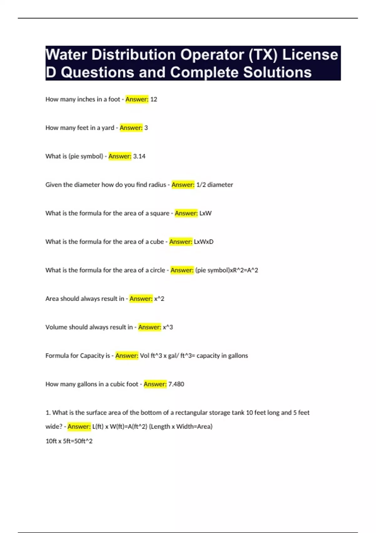 Water Distribution Operator (TX) License D Questions and Complete Solutions How many inches in a foot - Answer: 12 How many feet in a yard - Answer: 3 What is (pie symbol) - Answer: 3.14 Given the diameter how do you find radius - Answer: 1/2 diameter What is the formula for the area of a square - Answer: LxW What is the formula for the area of a cube - Answer: LxWxD What is the formula for the area of a circle - Answer: (pie symbol)xR^2=A^2 Area should always result in - Answer: x^2 Volume should always result in - Answer: x^3 Formula for Capacity is - Answer: Vol ft^3 x gal/ ft^3= capacity in gallons How many gallons in a cubic foot - Answer: 7.480 1. What is the surface area of the bottom of a rectangular storage tank 10 feet long and 5 feet wide? - Answer: L(ft) x W(ft)=A(ft^2) (Length x Width=Area) 10ft x 5ft=50ft^2 2. How many square feet is the roof of a chlorinator room 8 feet square? - Answer: L(ft) x W(ft)=A(ft^2) (Length x Width=Area) 8ft x 8ft=64ft^2 3. If a trench is 50 feet long and 6 feet wide, how many square feet will the bottom cover? - Answer: L(ft) x W(ft)=A(ft^2) (Length x Width=Area) 50ft x 6ft=300ft^2 4. What is the surface area of the bottom of a circular storage tank 20 feet in diameter? - Answer: (pie symbol) x R^2ft=Aft^2 (3.14 x radius=Area) R=diameter/2 3.14 x 10ft x 10ft=314ft^2 5. What is the surface area of a 35-foot diameter circular roof covering a service center? - Answer: (pie symbol) x R^2ft=Aft^2 (3.14 x radius=Area) R=diameter/2 3.14 x 17.5ft x 17.5ft=961.6ft^2 6. How many square inches and square feet is the end section of a 6-inch pipe? - Answer: (pie symbol) x R^2in=Ain^2 (3.14 x radius=Area) R=diameter/2 3.14 x 3in x 3in=28.26in^2 Convert to ft (28.26in/144(12in^2))=0.196ft^2 7. How many square feet is the end section of an 18-inch pipe? - Answer: (pie symbol) x R^2ft=Aft^2 (3.14 x radius=Area) R=diameter/2 3.14 x 0.75ft x 0.75ft=1.766ft^2 convert to ft (R/in(12 inches in a foot)) 9/12=0.75 8. How many square feet is the end section of a 24-inch pipe? - Answer: (pie symbol) x R^2ft=Aft^2 (3.14 x radius=Area) R=diameter/2 3.14 x 1ft x 1ft=3.14ft^2 9. How many square feet is the end section of a 36-inch pipe? - Answer: (pie symbol) x R^2ft=Aft^2 (3.14 x radius=Area) R=diameter/2 3.14 x 1.5ft x 1.5ft=7.065ft^2 1. How many gallons of water will a 20,000 cubic foot tank hold? - Answer: volume in ft^3 x gal / ft^3 =capacity in gallons 2. How many cubic yards of dirt are removed from a trench 60 feet long, 5 feet wide and 5 feet deep? - Answer: LxWxD/ft^3/yd^3=yd^3 60ftx5ftx5ft/27yd^3=55.55yd^3 3. A rectangular storage tank is 25 feet wide, 40 feet long and 10 feet deep. What is the volume in cubic feet and gallons? - Answer: LxWxD= Vol ft^3 25ftx40ftx40ft=10,000 ft^3 volume in ft^3 x gal / ft^3 =capacity in gallons 10,000x7.48=74,800 4. Calculate the cubic yards of dirt removed from a trench 2000 feet long, 4 feet wide and 6 feet deep. - Answer: LxWxD/ft^3/yd^3=yd^3 2000ftx4ftx6ft/27=1,777.7yd^3