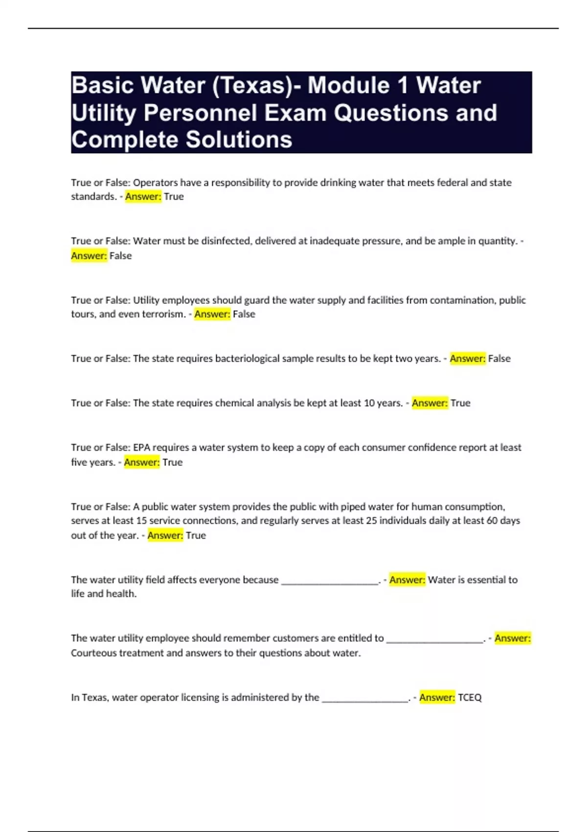Basic Water (Texas)- Module 1 Water Utility Personnel Exam Questions and Complete Solutions True or False: Operators have a responsibility to provide drinking water that meets federal and state standards. - Answer: True True or False: Water must be disinfected, delivered at inadequate pressure, and be ample in quantity. - Answer: False True or False: Utility employees should guard the water supply and facilities from contamination, public tours, and even terrorism. - Answer: False True or False: The state requires bacteriological sample results to be kept two years. - Answer: False True or False: The state requires chemical analysis be kept at least 10 years. - Answer: True True or False: EPA requires a water system to keep a copy of each consumer confidence report at least five years. - Answer: True True or False: A public water system provides the public with piped water for human consumption, serves at least 15 service connections, and regularly serves at least 25 individuals daily at least 60 days out of the year. - Answer: True The water utility field affects everyone because __________________. - Answer: Water is essential to life and health. The water utility employee should remember customers are entitled to __________________. - Answer: Courteous treatment and answers to their questions about water. In Texas, water operator licensing is administered by the ________________. - Answer: TCEQ All public water systems are required to employ licensed operators even if the system only ________________ treated water bought from another source. - Answer: Redistributes Public water systems include cities, municipal utility districts, rural water supply corporations, mobile home parks, and ____________________. - Answer: Campgrounds Examples of community water systems include ______________________. - Answer: Municipalities, municipal utility districts, rural water supply corporations, and mobile home parks. A federal agency impacting the water utility industry is the __________. - Answer: EPA The most important federal law impacting the water utility industry is the ______________________________. - Answer: Safe Drinking Water Act The four national safety and quality standards for drinking water covered in the Safe Drinking Water Act are physical, chemical, _______________________, and radiological. - Answer: Bacteriological The state agency that regulates drinking water in Texas and administers the federal Safe Drinking Water Act is the _____________. - Answer: TCEQ Water utility system personnel are required to notify the TCEQ of changes or alterations of the system, a new facility to be built, and water supply ______________. - Answer: Health hazards Some regional and local agencies impacting the water utility industry are municipal utility districts, rural water supply corporations, drainage districts, ___________________________, groundwater conservation districts, and subsidence districts. - Answer: River authorities
