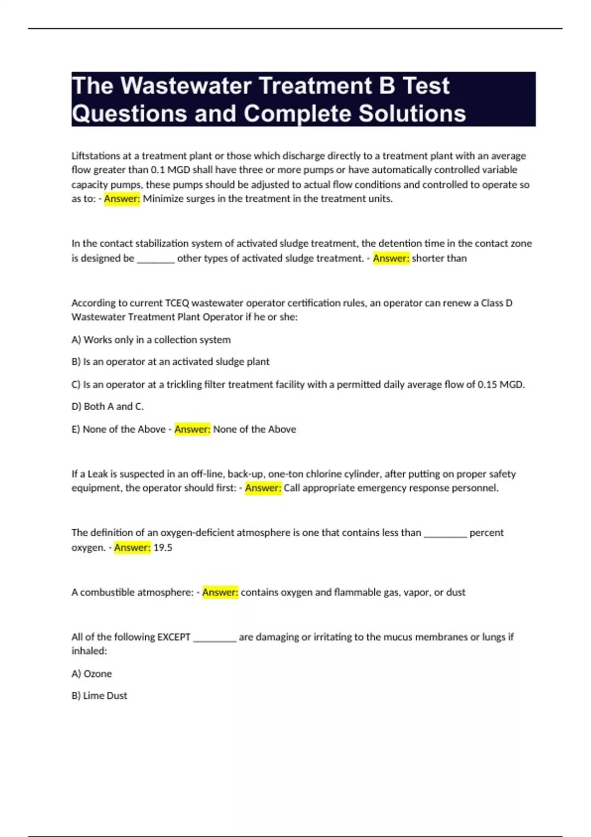 The Wastewater Treatment B Test Questions and Complete Solutions Liftstations at a treatment plant or those which discharge directly to a treatment plant with an average flow greater than 0.1 MGD shall have three or more pumps or have automatically controlled variable capacity pumps, these pumps should be adjusted to actual flow conditions and controlled to operate so as to: - Answer: Minimize surges in the treatment in the treatment units. In the contact stabilization system of activated sludge treatment, the detention time in the contact zone is designed be _______ other types of activated sludge treatment. - Answer: shorter than According to current TCEQ wastewater operator certification rules, an operator can renew a Class D Wastewater Treatment Plant Operator if he or she: A) Works only in a collection system B) Is an operator at an activated sludge plant C) Is an operator at a trickling filter treatment facility with a permitted daily average flow of 0.15 MGD. D) Both A and C. E) None of the Above - Answer: None of the Above If a Leak is suspected in an off-line, back-up, one-ton chlorine cylinder, after putting on proper safety equipment, the operator should first: - Answer: Call appropriate emergency response personnel. The definition of an oxygen-deficient atmosphere is one that contains less than ________ percent oxygen. - Answer: 19.5 A combustible atmosphere: - Answer: contains oxygen and flammable gas, vapor, or dust All of the following EXCEPT ________ are damaging or irritating to the mucus membranes or lungs if inhaled: A) Ozone B) Lime Dust C) Chlorine Gas D) Carbon Dioxide E) Ferric Chloride Dust - Answer: Ozone The Sludge Volume Index (SVI) is: - Answer: the volume of settled sludge (30-minutes) in ml/L times 1000, divided by the concentration in mg/L of MLSS. Biomonitoring - Answer: Involves the use of aquatic life to test the toxicity of a wastewater treatment plant effluent. A 24-Hour composite sample was tested for chlorine residual and found to contain none. These results indicate that: - Answer: Residual chlorine was NOT present during the 24-hour period. In an activated sludge treatment plant, the 30 minute settleability test indicates: A) The clarity of the effluent B) The influence of surface tension settling C) The current settling capabilities in the clarifier D) The ability of the organisms to flocculate and settle. E) All of the above - Answer: E) All of the above Setting work goals for an individual works best - Answer: Accompanied by an action plan One element of being an effective communicator is to: - Answer: be a good listener An efficient primary clarifier is expected to remove _______ of the influent, settable solids. - Answer: 90 percent or better Primary wastewater treatment facilities make use of - Answer: the force of gravity and density differences between the water and the solids. If the inside diameter of the lift station wet well is 8 feet, and the vertical separation between "lead pump on" and "all pumps off" (low water line) is 4 feet 9 inches, the approximate storage in the wet well during a normal pump cycle is: - Answer: 1,785 gallons Assume that both pumps shown in the exhibit are working. The function of float switch B is to turn : - Answer: The lead pump on The extent of treatment necessary at a particular wastewater treatment plant depends upon: A) The treatment plant location B) Water quality standards set for the receiving stream C) Amount and final use of the treatment plant effluent D) the type and concentration of wastes received at the plant for treatment . E) All of the above - Answer: All of the above In most pressure sewer systems, the plumbing units or grinder pumps at each residence are considered to be - Answer: the integral part of the wastewater collection system Assume that a pumping unit with a 14 3/4 inch impeller has characteristics as described by the pump curve shown in the exhibit. If the pumping unit is working against a static head of 47 feet, and the force main on the discharge side has a total friction loss of 4 feet, the approximate pump discharge should be - Answer: 1550 gallons per minute Assume that a pumping unit with a 13 1/4 inch impeller has a characteristics as described by the pump curve shown in the exhibit. If the pumping unit has a total dynamic head of 38 feet, the approximate pump discharge should be: - Answer: Proper operation of a facultative pond system requires that - Answer: adequate DO be maintained at the surface at all times. In a washing grit remover, the grit is moved slowly by screw conveyers up an inclined channel in order to - Answer: decrease the amount of organic matter in the grit. The amount of organic matter removed by a trickling filter is dependent of the recirculation ratio - Answer: True The purpose of returning the solids from the bottom of the clarifier to aeration tank in the activated sludge process is to: - Answer: Remove the solids that accumulate in the clarifier, and to reseed the aeration tank with biologically active solids. In the extended aeration activated sludge process, the biological mass is kept. - Answer: within the endogenous phase The extended air activated sludge treatment process - Answer: is the simplest activated sludge process, and easier to operate than most other activated sludge processes. Microscopic examination of a good settling sludge should show a predominance of - Answer: free swimming and stalked ciliates with few rotifers and flagellates. In an activated sludge treatment plant, a SVI of 180 would indicate: - Answer: A "bulky" sludge. If nitrification is desired in an activated sludge system, then the DO should be maintained above 2 mg/l because: - Answer: excessive oxygen speeds up the nitrification process. The white, thick billowing foam common during the start up of an activated sludge wastewater treatment plant results from high MLSS - Answer: False In a activated sludge process, the results of a mixed liquor settling test indicate 