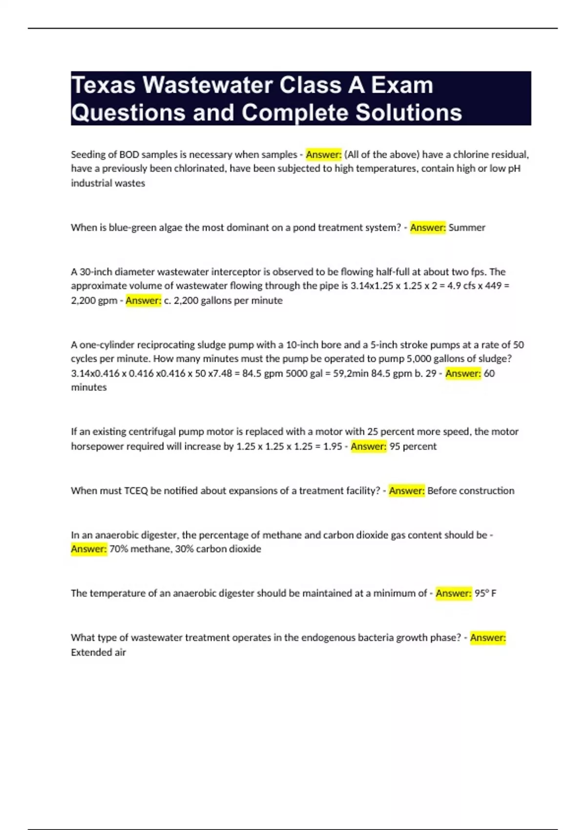 Texas Wastewater Class A Exam Questions and Complete Solutions Seeding of BOD samples is necessary when samples - Answer: (All of the above) have a chlorine residual, have a previously been chlorinated, have been subjected to high temperatures, contain high or low pH industrial wastes When is blue-green algae the most dominant on a pond treatment system? - Answer: Summer A 30-inch diameter wastewater interceptor is observed to be flowing half-full at about two fps. The approximate volume of wastewater flowing through the pipe is 3.14x1.25 x 1.25 x 2 = 4.9 cfs x 449 = 2,200 gpm - Answer: c. 2,200 gallons per minute A one-cylinder reciprocating sludge pump with a 10-inch bore and a 5-inch stroke pumps at a rate of 50 cycles per minute. How many minutes must the pump be operated to pump 5,000 gallons of sludge? 3.14x0.416 x 0.416 x0.416 x 50 x7.48 = 84.5 gpm 5000 gal = 59,2min 84.5 gpm b. 29 - Answer: 60 minutes If an existing centrifugal pump motor is replaced with a motor with 25 percent more speed, the motor horsepower required will increase by 1.25 x 1.25 x 1.25 = 1.95 - Answer: 95 percent When must TCEQ be notified about expansions of a treatment facility? - Answer: Before construction In an anaerobic digester, the percentage of methane and carbon dioxide gas content should be - Answer: 70% methane, 30% carbon dioxide The temperature of an anaerobic digester should be maintained at a minimum of - Answer: 95° F What type of wastewater treatment operates in the endogenous bacteria growth phase? - Answer: Extended air Why is recirculation needed in a trickling filter? - Answer: Keep the media wet Further reduce BOD All of the above (a, b, and c) What type of fire extinguisher would be used on an electrical control panel that has been de-energized? - Answer: Class A Class C (a and d) Disinfection with chlorine is the most effective at a pH of - Answer: 6.0 The biomass on a normal functioning RBC has what appearance? - Answer: Grey to brown and 0.05 to 0.1 inch thick The sludge from a primary clarifier should percent solids? - Answer: 4% to 6% What is eutrophication in a pond system? - Answer: Enrichment with nitrogen and phosphorous Causes algae blooms (b and c) How often should pH meters be calibrated? - Answer: Daily In Texas, pH meters are required to be calibrated on how many buffers? - Answer: two An industrial complex has a BOD discharge to the POTW of 500 pounds per day. The population equivalent of this industry is 500 lbs = 2,941 0.17 lbs BOD person - Answer: 2941 The parameters of the BOD test are - Answer: 5 days at 20° Centigrade Standard Dimension Ratio in pvc pipe is defined as - Answer: Ratio of OD pipe diameter to wall thickness How should shoring be removed from a trench? - Answer: up from the bottom up In low pressure sewer systems where each tap must have a grinder pump lift station, station is considered to be - Answer: part of the collection system and the responsibility of the utility Effective communication depends on - Answer: being a good listener When designing a wastewater collection system, the engineer considers the population for how many years in the future? - Answer: 50 According to 30 TAC Chapter 317, all pipe and fittings used in wastewater pressure shall have a minimum psi pressure rating of - Answer: 150 The minimum velocity of flow in a wastewater line should be - Answer: 2.0 fps At a construction job site, as the roadway speed increases, the spacing between cones and barricades should - Answer: increase The major cause of wastewater line stoppages is - Answer: roots and grease Carbon monoxide (CO) poisoning symptoms are - Answer: tightness in the chest nausea drowsiness and headache (all of the above) The smallest pipe size for air recirculation of a self-priming centrifugal pump is - Answer: 1 inch Dangerous gases in a confined space may not be detected with the physical senses because - Answer: some gases have no odor some gases may deaden the sense of smell some gases may displace the oxygen (all of the above) What are the dangerous gases a collection system worker might come into contact with? - Answer: CO2 CO НaS CH4 (all of the above) On a construction job site, equipment booms must maintain at least how many feet of clearance from overhead electric lines? - Answer: 10 How should trench shoring be installed? - Answer: to above the top of the trench When setting work goals for an employee, the goals should be - Answer: accompanied by an action plan According to Chapter 317, Design Criteria, a manhole can be installed within 9 feet of an existing waterline if - Answer: the manhole is completely watertight and tested for no leakage As the population of a collection system increases, the ratio of peak flow to average daily flow will - Answer: decrease Motivating workers to do a better job is best done by - Answer: letting workers participate in setting goals One important element of a good communicator is - Answer: being a good listener Monitoring and reporting records of a wastewater treatment plant shall be kept at the facility site for a period of - Answer: d. three years The TCEQ Design Criteria requires that deflection tests be performed on all new installed flexible or semi-rigid pipe after the final backfill has been in place for 30 days. This deflection test is usually performed using a rigid ball or mandrel that has a diameter equal to -percent of the inside diameter of the pipe. - Answer: c. 95 Seeding of BOD samples is necessary when samples - Answer: e. all of the above A one-cylinder reciprocating sludge pump with a 10-inch bore and a 5-inch stroke pumps at rate of 50 cycles per minute. How many minutes must the pump be operated to pump 5,000 gallons of sludge? - Answer: 3.14 x0.416 x0.416 x0.416 x 50x7.48 = 84.5 gpm 5000 gal = 59.2min 84.5 gpm d. 60 minutes e. When is blue-green algae the most dominant on a pond treatment system? - Answer: Summer What is the purpose of biomonitoring of a plant's effluent? - Answer: d. Test for toxici