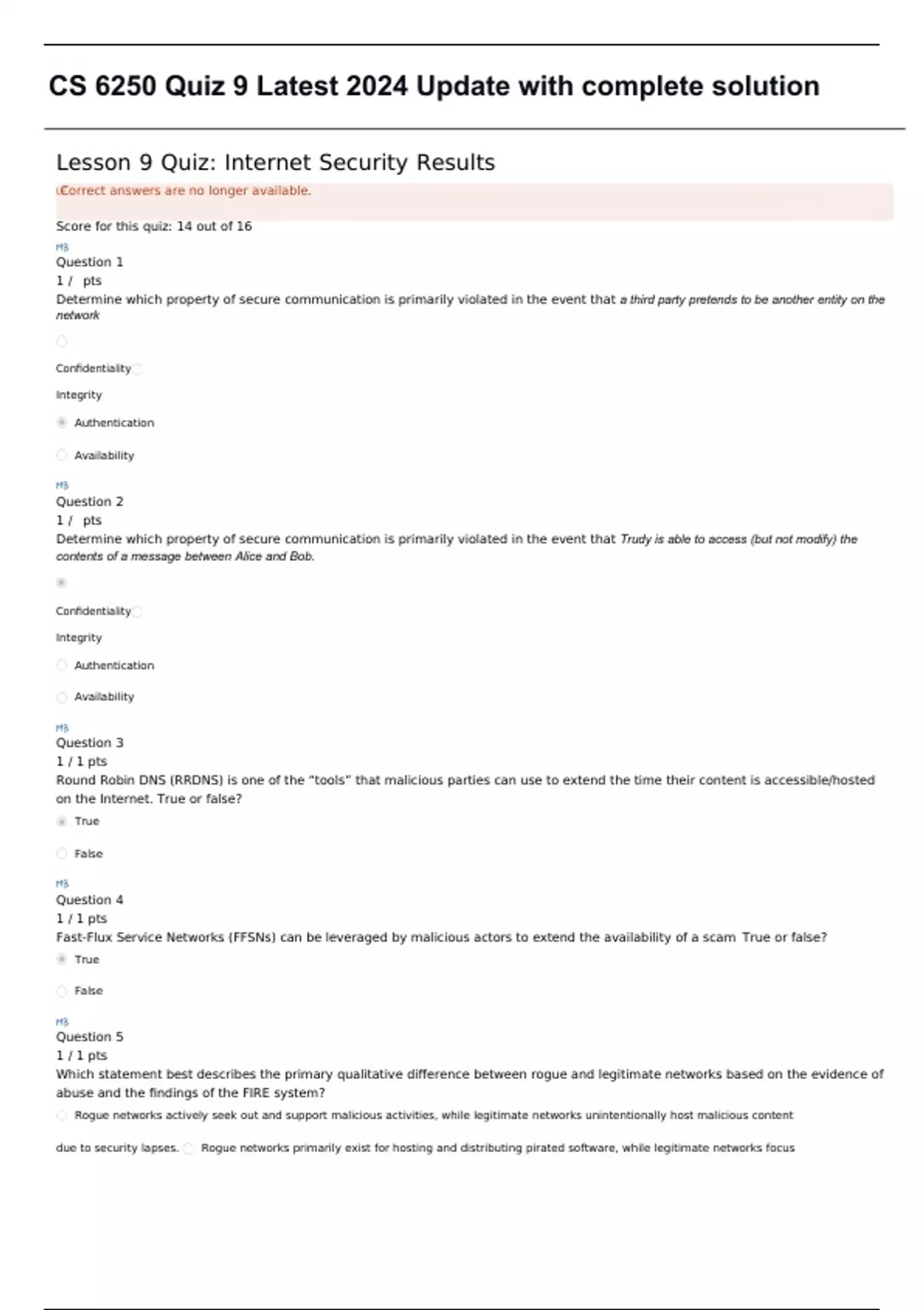 CS 6250 Quiz 9 Latest 2024 Update with complete solution Lesson 9 Quiz: Internet Security Results Score for this quiz: 14 out of 16  Question 1 1 / pts Determine which property of secure communication is primarily violated in the event that a third party pretends to be another entity on the network Confidentiality Integrity Authentication Availability  Question 2 1 / pts Determine which property of secure communication is primarily violated in the event that Trudy is able to access (but not modify) the contents of a message between Alice and Bob. Confidentiality Integrity Authentication Availability  Question 3 1 / 1 pts Round Robin DNS (RRDNS) is one of the “tools” that malicious parties can use to extend the time their content is accessible/hosted on the Internet. True or false? True False  Question 4 1 / 1 pts Fast-Flux Service Networks (FFSNs) can be leveraged by malicious actors to extend the availability of a scam True or false? True False  Question 5 1 / 1 pts Which statement best describes the primary qualitative difference between rogue and legitimate networks based on the evidence of abuse and the findings of the FIRE system? Rogue networks actively seek out and support malicious activities, while legitimate networks unintentionally host malicious content due to security lapses. Rogue networks primarily exist for hosting and distributing pirated software, while legitimate networks focus on genuine content distribution. The longevity of malicious behavior on rogue networks is significantly longer, often lasting weeks to over a year, whereas legitimate networks usually remove malicious content within a few days. The primary distinction is based on the geographical location of the network servers, with rogue networks predominantly located in regions with lax cyber regulations.  Question 6 1 / 1 pts The FIRE system takes primarily a reactive approach to infer network reputation, relying on monitoring IP blacklists. True False  Question 7 1 / 1 pts ASwatch takes primarily a proactive approach to infer network reputation by monitoring the routing behavior of networks. True False  Question 8 1 / 1 pts How can a rogue network remain undetected by ASwatch (stay under the radar)? By switching frequently to a different upstream provider. By lowering the ratio of malicious IP addresses to the total owned IP addresses. By maintaining a stable control plane behavior.  IncorrectQuestion 9 0 / 1 pts Determine which system monitors routing behavior to determine the legitimacy of a network. FIRE ASwatch ARTEMIS Stellar  Question 10 1 / 1 pts Determine which system uses routing behavior to detect BGP hijacking attacks. FIRE ASwatch ARTEMIS Stellar  Question 11 1 / 1 pts BGP Blackholing is a defense against prefix hijacking. True False  Question 12 1 / 1 pts The BGP blackholing technique can only be applied for traffic related to specific applications. True False  Question 13 1 / 1 pts In a reflection and amplification DDoS attack (demonstrated in the image below), whose IP address is spoofed to direct amplified traffic to the intended victim? IP Address of the Victim IP address of the Reflector IP address of the Master IP address of the Slaves  Question 14 1 / 1 pts When designing a system to identify DNS reflection and amplification attacks, which network operation plane(s) is essential to monitor for effective detection? Control Plane Data Plane Management Plane Control Plane and Data Plane  IncorrectQuestion 15 0 / 1 pts To effectively identify BGP hijacking incidents, specifically targeting BGP path and prefix manipulations, which network operation plane(s) should you primarily monitor? Control Plane Data Plane Management Plane Control Plane and Data Plane  Question 16 1 / 1 pts Which of the following techniques can help an attacker to attract more traffic when attempting to hijack a prefix? Select all that apply. Advertise a more specific prefix than the original owner AS Advertise a shorter path to the prefix. Advertise the same path as the original owner AS but change the origin AS. Quiz Score: 14 out of 16