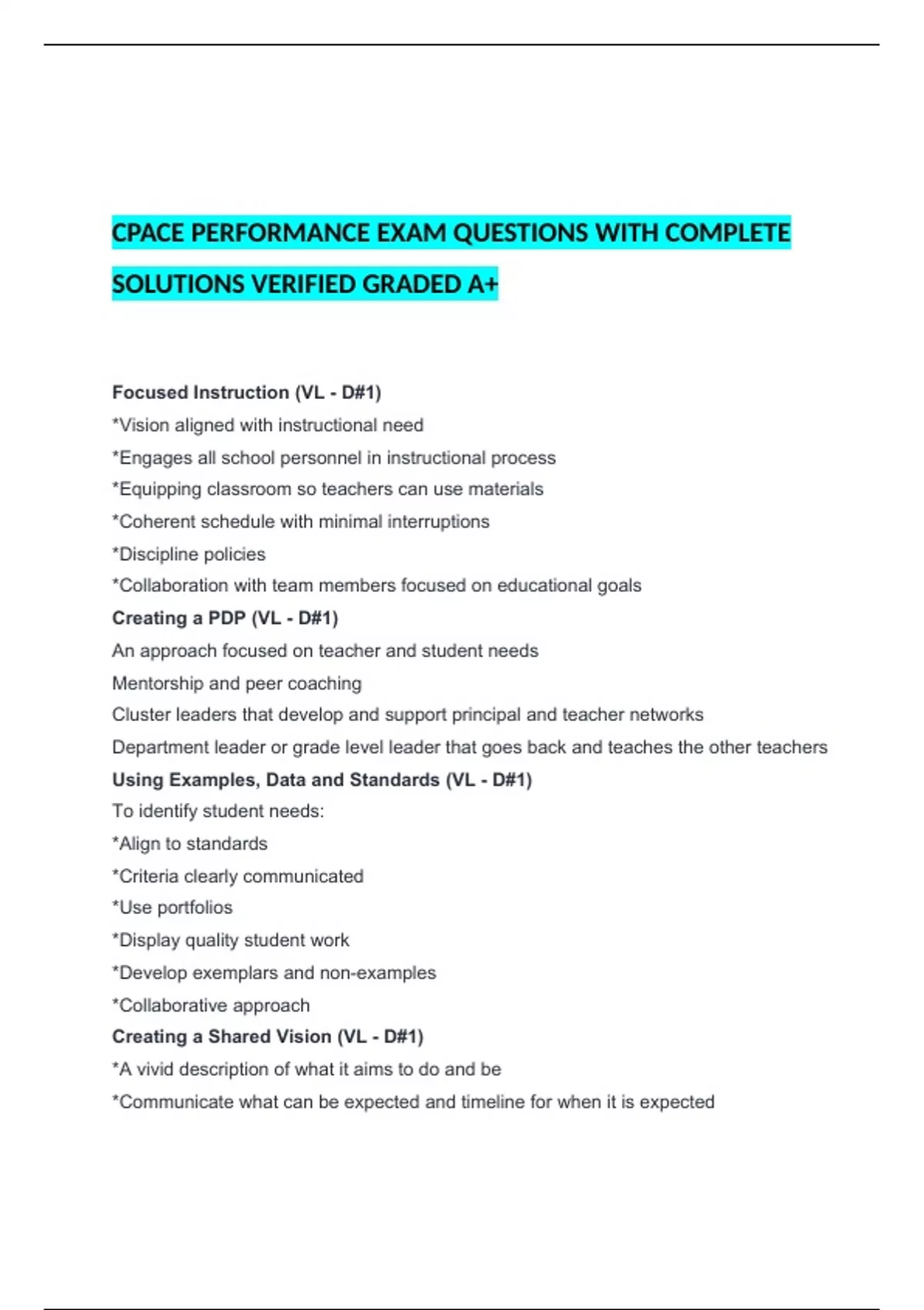 CPACE PERFORMANCE EXAM QUESTIONS WITH COMPLETE SOLUTIONS VERIFIED GRADED A+ Focused Instruction (VL - D#1) *Vision aligned with instructional need *Engages all school personnel in instructional process *Equipping classroom so teachers can use materials *Coherent schedule with minimal interruptions *Discipline policies *Collaboration with team members focused on educational goals Creating a PDP (VL - D#1) An approach focused on teacher and student needs Mentorship and peer coaching Cluster leaders that develop and support principal and teacher networks Department leader or grade level leader that goes back and teaches the other teachers Using Examples, Data and Standards (VL - D#1) To identify student needs: *Align to standards *Criteria clearly communicated *Use portfolios *Display quality student work *Develop exemplars and non-examples *Collaborative approach Creating a Shared Vision (VL - D#1) *A vivid description of what it aims to do and be *Communicate what can be expected and timeline for when it is expected *Allows everyone to work for a common goal *If vision is truly shared, it will be evident in the school climate and culture. Mission Statement (VL - D#1) Describes how the school plans to achieve the vision: *Purpose *Priorities *Requirements *Operational cornerstones Establishing Behavioral Norms (VL - D#1) Norms 1. Student handbooks 2. Collaboration with students and staff 3. proactive approach that attempts to diagnose and preventively address factors 4. Support services 5. Rigorous curriculum Goals and Objectives (VL - D#1) *Goals are specific and quantifiable *Goals can be broken down into very specific objectives within a timeline. *If you can't break it down, it's probably not a feasible goal. SMART Goals (VL - D#1) Specific = What will be accomplished Measurable = How success will be quantified Achievable = Not unrealistic Relevant = How it fits with overall mission Time-bound = Intermittent checkpoints Characteristics of High Performing Schools (VL - D#1) 1. Clear and shared focus 2. High standards & expectations 3. Effective school leadership 4. High levels of collaboration & communication 5. curriculum, instruction, assessment aligned with standards
