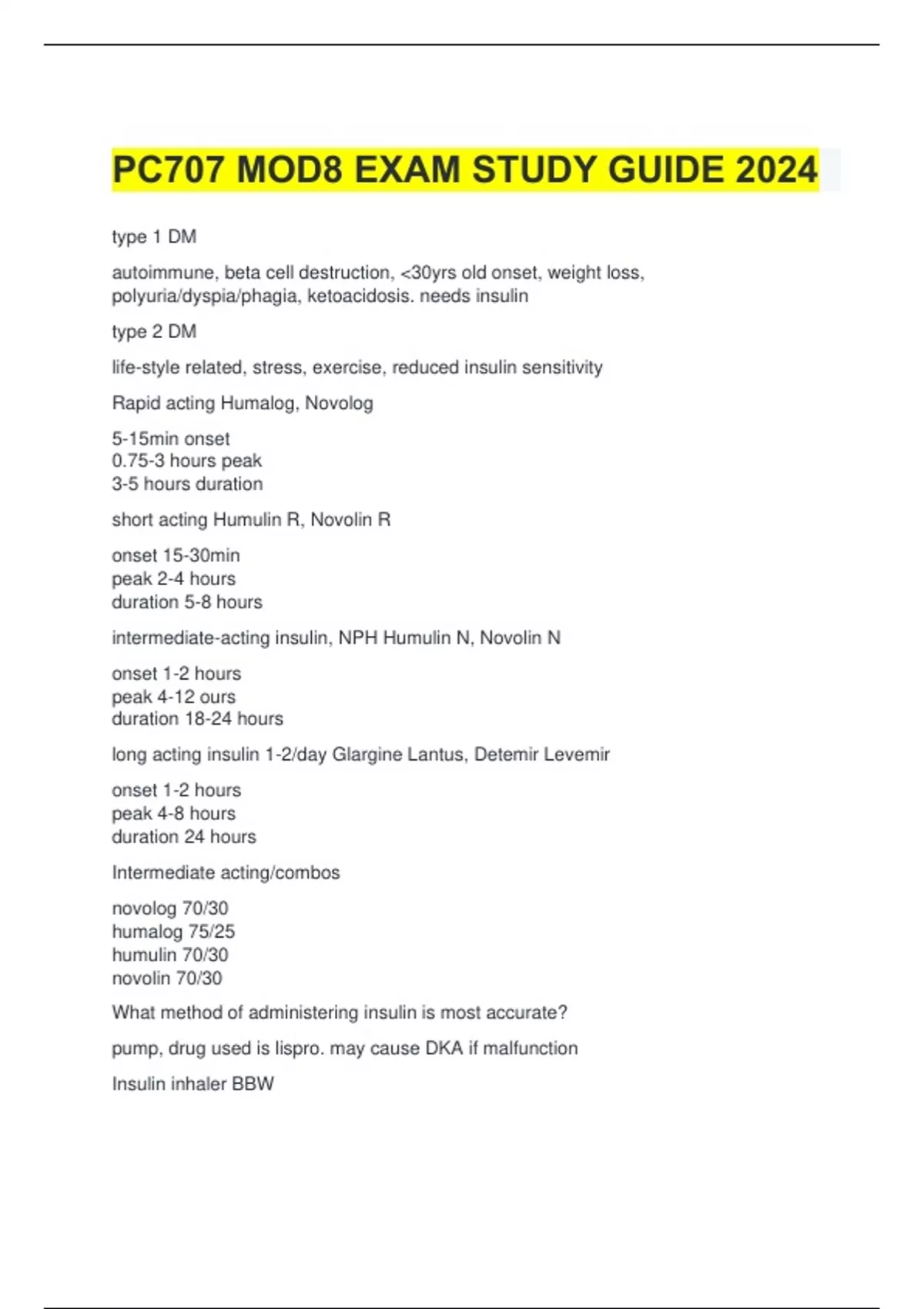 type 1 DM autoimmune, beta cell destruction, 30yrs old onset, weight loss, polyuria/dyspia/phagia, ketoacidosis. needs insulin type 2 DM life-style related, stress, exercise, reduced insulin sensitivity Rapid acting Humalog, Novolog 5-15min onset 0.75-3 hours peak 3-5 hours duration short acting Humulin R, Novolin R onset 15-30min peak 2-4 hours duration 5-8 hours intermediate-acting insulin, NPH Humulin N, Novolin N onset 1-2 hours peak 4-12 ours duration 18-24 hours long acting insulin 1-2/day Glargine Lantus, Detemir Levemir onset 1-2 hours peak 4-8 hours duration 24 hours Intermediate acting/combos novolog 70/30 humalog 75/25 humulin 70/30 novolin 70/30 What method of administering insulin is most accurate? pump, drug used is lispro. may cause DKA if malfunction Insulin inhaler BBW acute bronchospasm has been observed in pts with asthma and COPD using inhaled insulin. Gliptins/Dipeptidyl peptidase DPP4 inhibits insulin release, reduce glucagon release, decrease hepatic glucose production Metformin MOA inhibits glucose production in liver, reduce absorption in gut, sensitized insulin receptors on targe tissues to increase glucose uptake. Does metformin drive down blood sugars? no, little risk of hypoglycemia metformin BBW lactic acidosis with severe renal impairment how to take metformin? take with meals, dc before surgery or IV contrast 48 hours, avoid etho, GI issues resovle in 3 months, contra if GFR 30 metformin d2d metformin and cimetidine (tagamet) Sulfonylureas 1st and 2nd gen 1st, not used as often 2nd, greater potency, less d2d requirements of sulfonylureas requires working beta cells, as DM progresses, it is less effective Sulfonylureas SE hypoglycemia, caution w/elderly, stop before starting insulin, nausea, skin rash, abnormal liver fx, weight gain. sulfonylureas d2d etho- enhance etho toxcicity abx-potentiate hypoglycemia bbl-mask hypoglycemia ophthalmic Dipeptidyl peptidase 4 DPP4 gliptins ex.