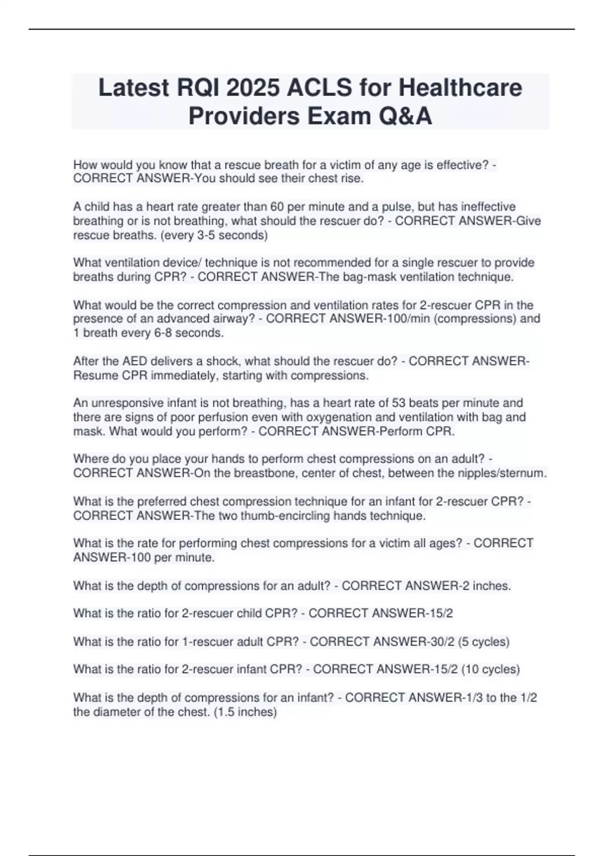 Latest RQI 2025 ACLS for Healthcare Providers Exam Q&A How would you know that a rescue breath for a victim of any age is effective? - CORRECT ANSWER-You should see their chest rise. A child has a heart rate greater than 60 per minute and a pulse, but has ineffective breathing or is not breathing, what should the rescuer do? - CORRECT ANSWER-Give rescue breaths. (every 3-5 seconds) What ventilation device/ technique is not recommended for a single rescuer to provide breaths during CPR? - CORRECT ANSWER-The bag-mask ventilation technique. What would be the correct compression and ventilation rates for 2-rescuer CPR in the presence of an advanced airway? - CORRECT ANSWER-100/min (compressions) and 1 breath every 6-8 seconds. After the AED delivers a shock, what should the rescuer do? - CORRECT ANSWERResume CPR immediately, starting with compressions. An unresponsive infant is not breathing, has a heart rate of 53 beats per minute and there are signs of poor perfusion even with oxygenation and ventilation with bag and mask. What would you perform? - CORRECT ANSWER-Perform CPR. Where do you place your hands to perform chest compressions on an adult? - CORRECT ANSWER-On the breastbone, center of chest, between the nipples/sternum. What is the preferred chest compression technique for an infant for 2-rescuer CPR? - CORRECT ANSWER-The two thumb-encircling hands technique. What is the rate for performing chest compressions for a victim all ages? - CORRECT ANSWER-100 per minute. What is the depth of compressions for an adult? - CORRECT ANSWER-2 inches. What is the ratio for 2-rescuer child CPR? - CORRECT ANSWER-15/2 What is the ratio for 1-rescuer adult CPR? - CORRECT ANSWER-30/2 (5 cycles) What is the ratio for 2-rescuer infant CPR? - CORRECT ANSWER-15/2 (10 cycles) What is the depth of compressions for an infant? - CORRECT ANSWER-1/3 to the 1/2 the diameter of the chest. (1.5 inches) When would you start CPR for any victim? - CORRECT ANSWER-When there's no breathing, pulse, or consciousnes