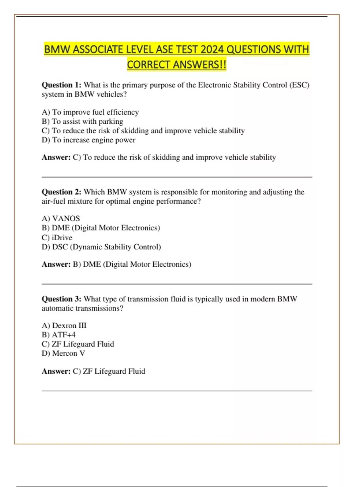 BMW ASSOCIATE LEVEL ASE TEST 2024 QUESTIONS WITH CORRECT ANSWERS!!