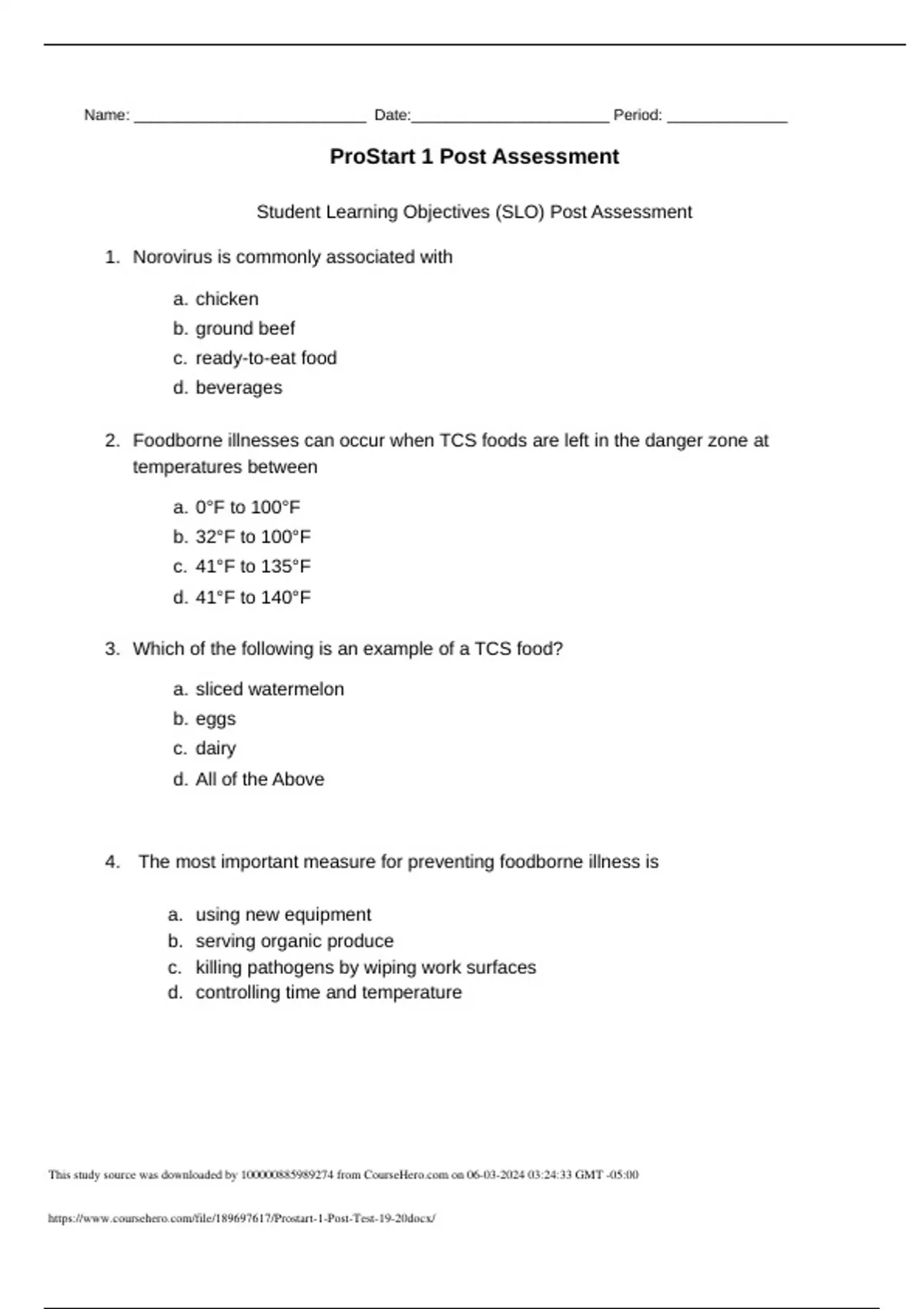 Prostart 1 Post Test Student Learning Objectives (SLO) Post Assessment