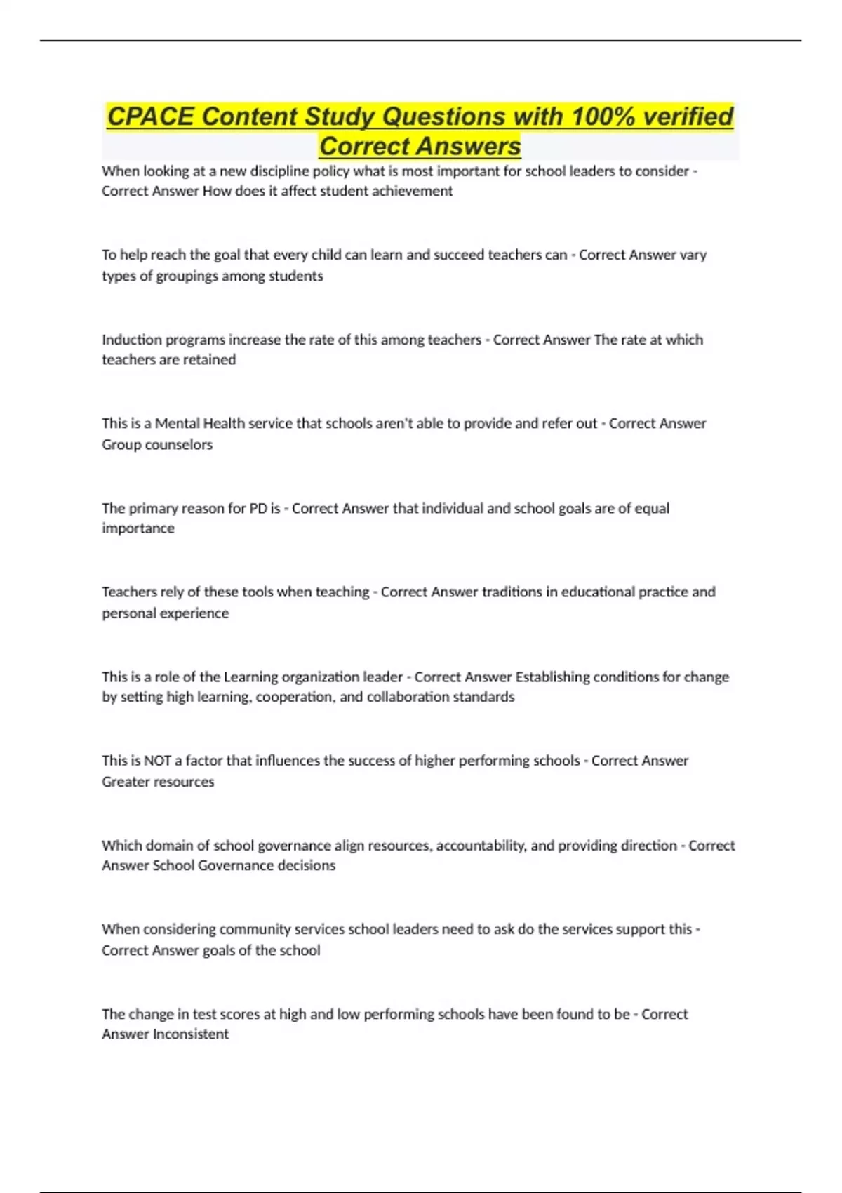 CPACE Content Study Questions with 100% verified Correct Answers When looking at a new discipline policy what is most important for school leaders to consider - Correct Answer How does it affect student achievement To help reach the goal that every child can learn and succeed teachers can - Correct Answer vary types of groupings among students Induction programs increase the rate of this among teachers - Correct Answer The rate at which teachers are retained This is a Mental Health service that schools aren't able to provide and refer out - Correct Answer Group counselors The primary reason for PD is - Correct Answer that individual and school goals are of equal importance Teachers rely of these tools when teaching - Correct Answer traditions in educational practice and personal experience This is a role of the Learning organization leader - Correct Answer Establishing conditions for change by setting high learning, cooperation, and collaboration standards This is NOT a factor that influences the success of higher performing schools - Correct Answer Greater resources Which domain of school governance align resources, accountability, and providing direction - Correct Answer School Governance decisions When considering community services school leaders need to ask do the services support this - Correct Answer goals of the school The change in test scores at high and low performing schools have been found to be - Correct Answer Inconsistent