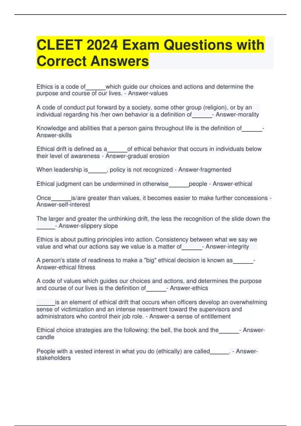 CLEET 2024 Exam Questions with Correct Answers Ethics is a code of which guide our choices and actions and determine the purpose and course of our lives. - Answer-values Knowledge and abilities that a person gains throughout life is the definition of - Answer-skills Ethical drift is defined as a of ethical behavior that occurs in individuals below their level of awareness - Answer-gradual erosion When leadership is , policy is not recognized - Answer-fragmented Ethical judgment can be undermined in otherwise people - Answer-ethical Once is/are greater than values, it becomes easier to make further concessions - Answer-self-interest The larger and greater the unthinking drift, the less the recognition of the slide down the - Answer-slippery slope A person's state of readiness to make a "big" ethical decision is known as - Answer-ethical fitness A code of values which guides our choices and actions, and determines the purpose and course of our lives is the definition of - Answer-ethics is an element of ethical drift that occurs when officers develop an overwhelming sense of victimization and an intense resentment toward the supervisors and administrators who control their job role. - Answer-a sense of entitlement Ethical choice strategies are the following: the bell, the book and the - Answer- candle People with a vested interest in what you do (ethically) are called . - Answer- stakeholders Law enforcement personnel commit critical unethical acts each day. occur when officers rationalize and justify not doing things they are responsible for doing. - Answer- acts of omission It is important to understand that is as important as the act. - Answer-motive is the state of mind or spirit that enables one to face danger with self-possession, confidence, resolution, bravery, and valor. - Answer-courage Refusing gratuities, refusing to participate in a cover-up, refusing to participate in ethnic or gender-based humor are examples of what kind of courage? - Answer-moral The ethical decision-making check list consists of the following: Is it legal? Is the decision balanced? and - Answer-how will I feel about myself after the decision? Ethics begins with good character. To develop character, we must build excellence, and building excellence begins with - Answer-myself "Cops don't snitch on other cops" can help foster the dilemma that officers will likely face during their careers - Answer-loyalty vs. integrity is the influence that one person exercises over a group of people by reason of the exemplary nature of their character. - Answer-moral ascendancy To perform as an "ethical" professional, you should . - Answer-consider all relevant sides of the ethical problem Acts wherein officers violate department rules are - Answer-acts of comission- administrative Which option is NOT one of the seven ethical standards expected by the communities? - Answer-citizenship presumed unreasonable under the Fourth Amendment Which class of person will not be permitted to testify as "lay" (non-expert) witnesses? - Answer-persons who have no knowledge of the facts of the case